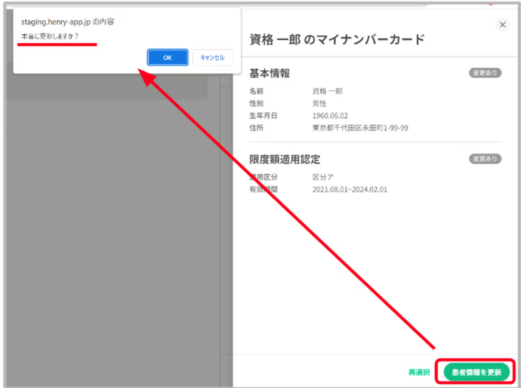 顔認証付きカードリーダを用いてマイナンバーカードを読み取った結果をHenryカルテで確認することができます。