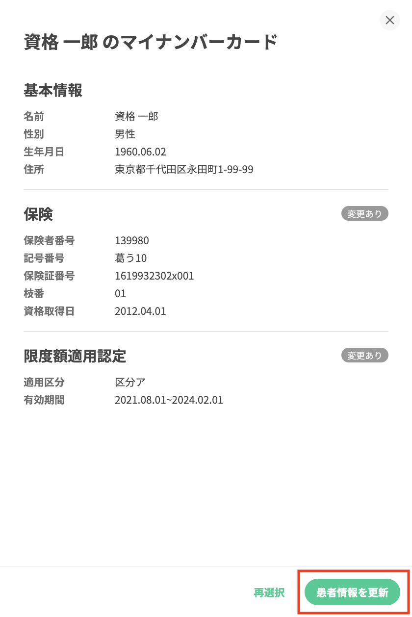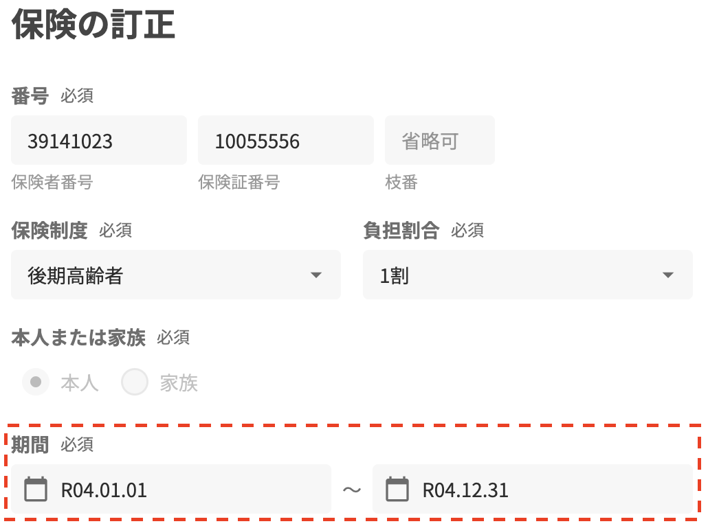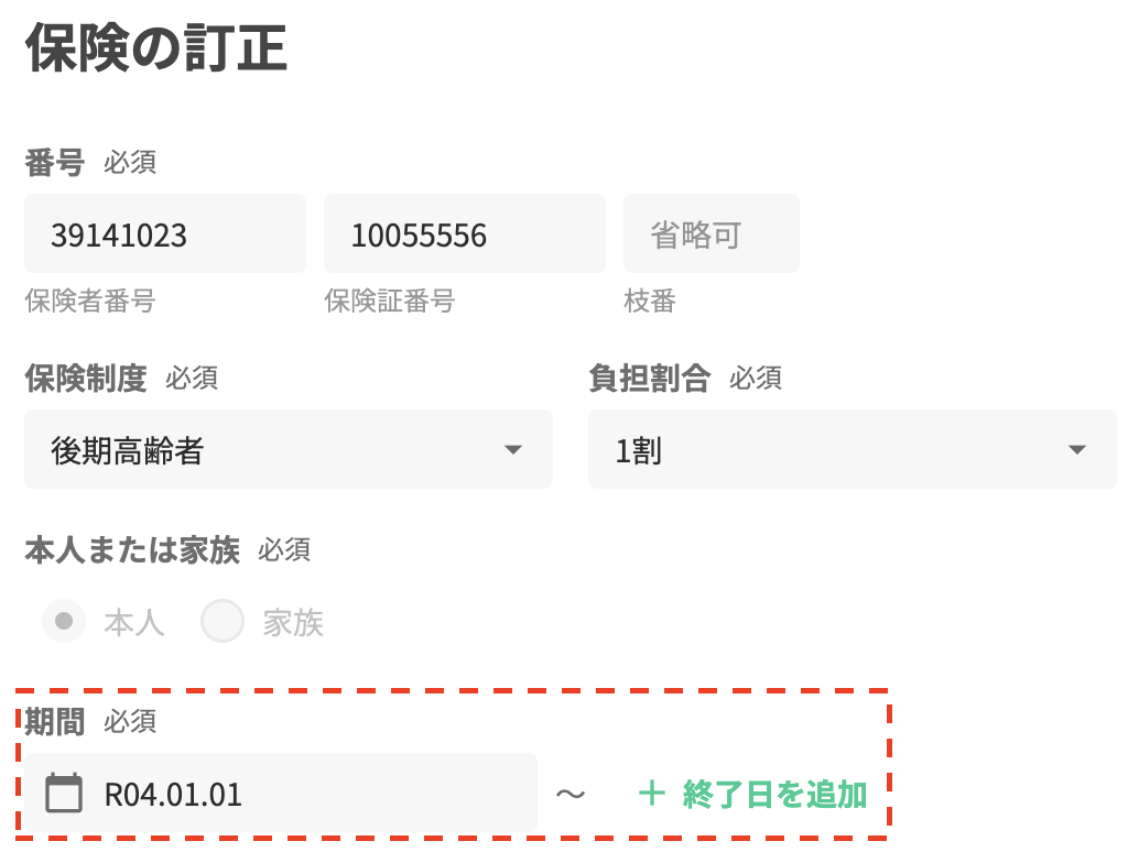 登録済みの保険が無効となっていることが想定されるため、マイナンバーカードから読み取った保険の資格取得日より前に、登録済みの保険の終了日を設定お願いします。
