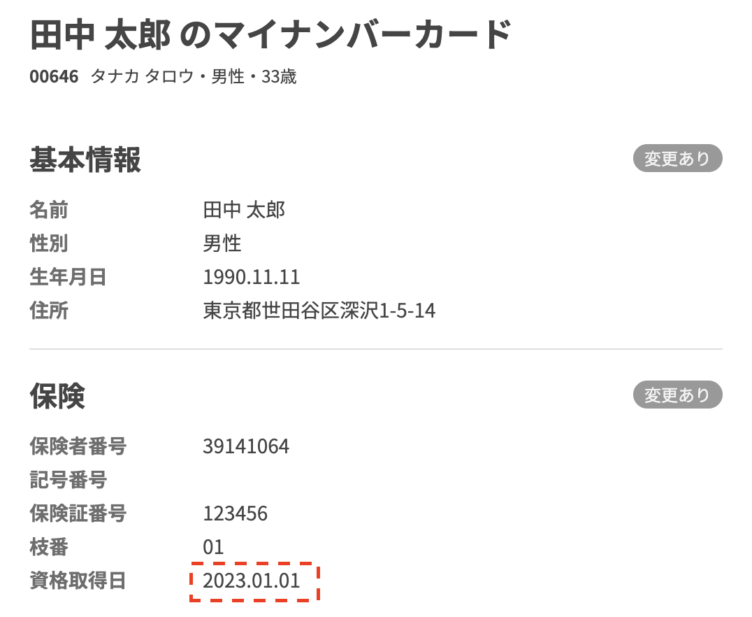 <例> ・マイナンバーカードから読み取った保険 保険情報 :39141064 資格取得日:2023(R05)年1月1日 ・登録済みの保険 保険情報 :39141023 開始日 :2022(R04)年1月1日 有効期間 :未入力