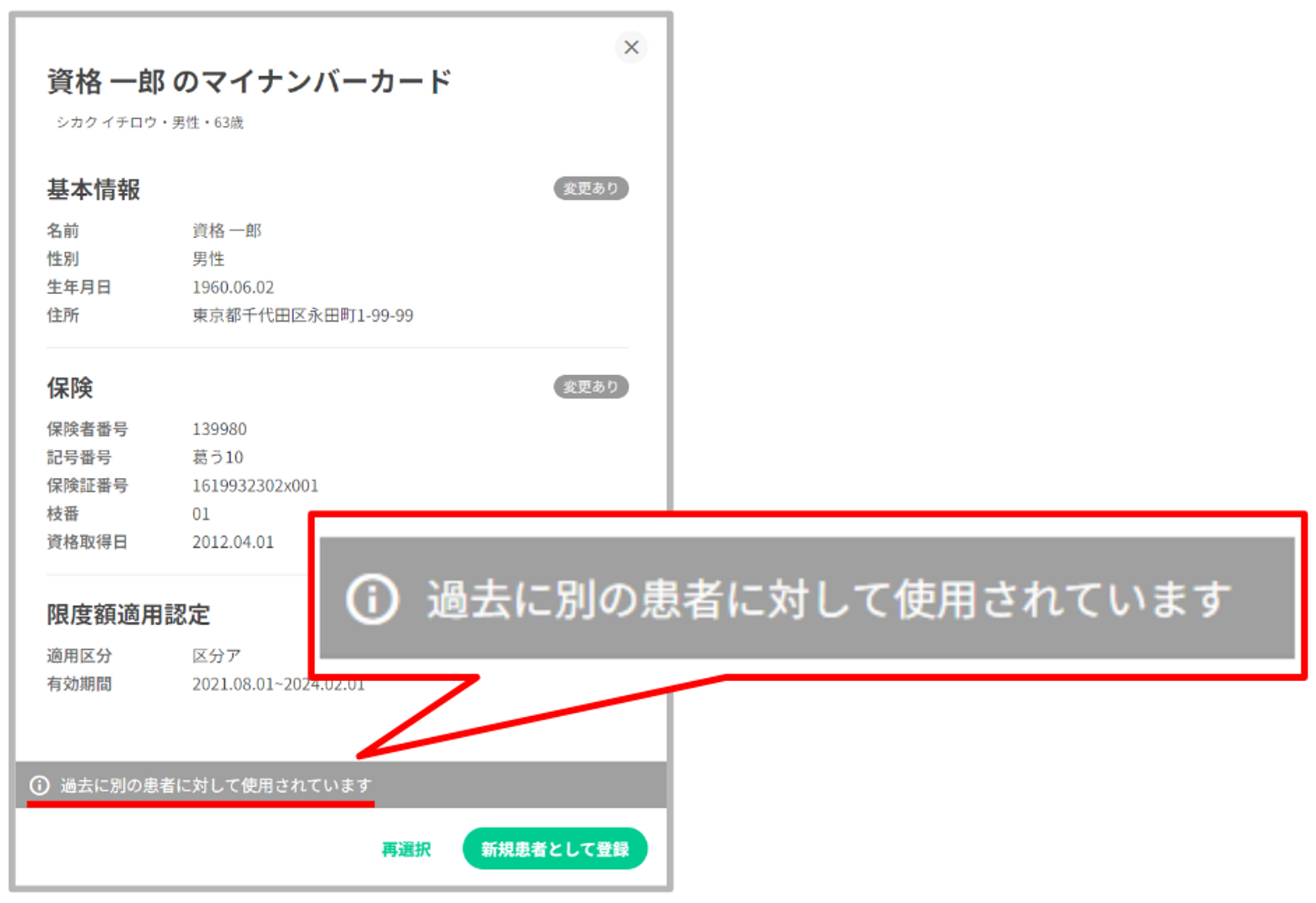 誤って選択してしまった場合は、正しい患者のIDを確認し、マイナンバーカード読み取り履歴より正しい患者の情報を再選択してください。