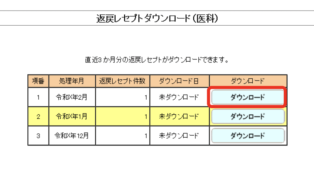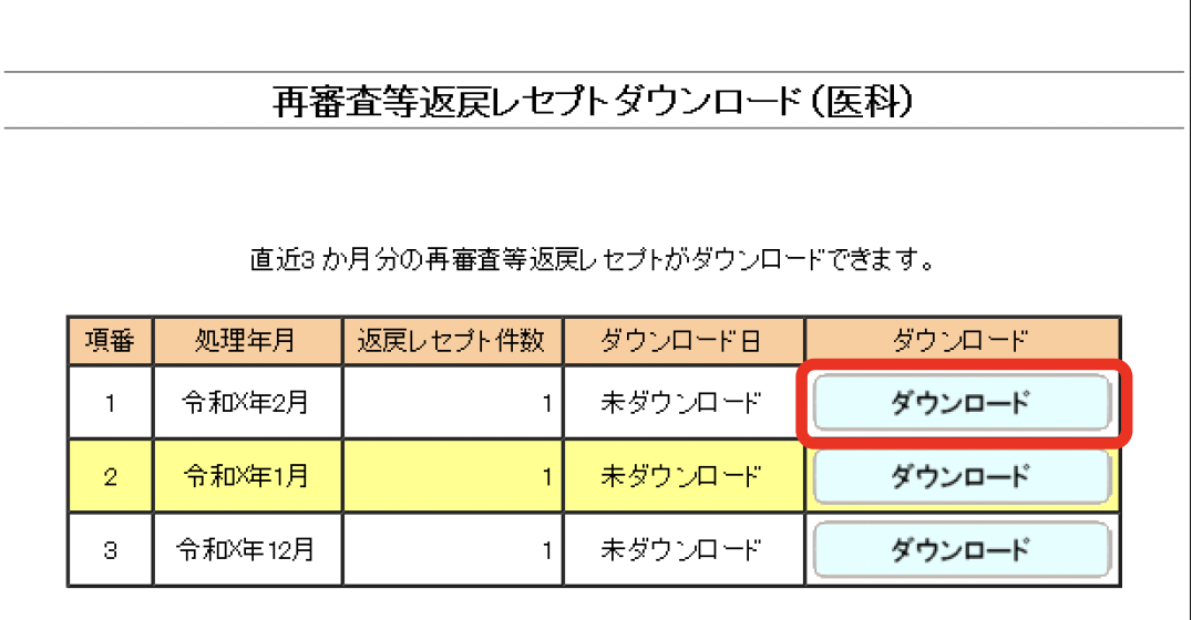 ※返戻レセプトは、直近3 か月分がダウンロードできます。 3か月を経過するとダウンロードができなくなるのでお気を付けください。 ※紙レセプトで請求した分の返戻レセプトは、ダウンロードできません。
