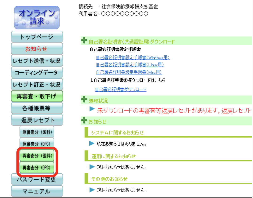 ※再審査等返戻レセプトがある場合は再審査等返戻レセプトをダウンロードします。 ※再審査等返戻レセプトは、直近3か月分がダウンロードできます。 3か月を経過するとダウンロードができなくなるのでお気を付けください。