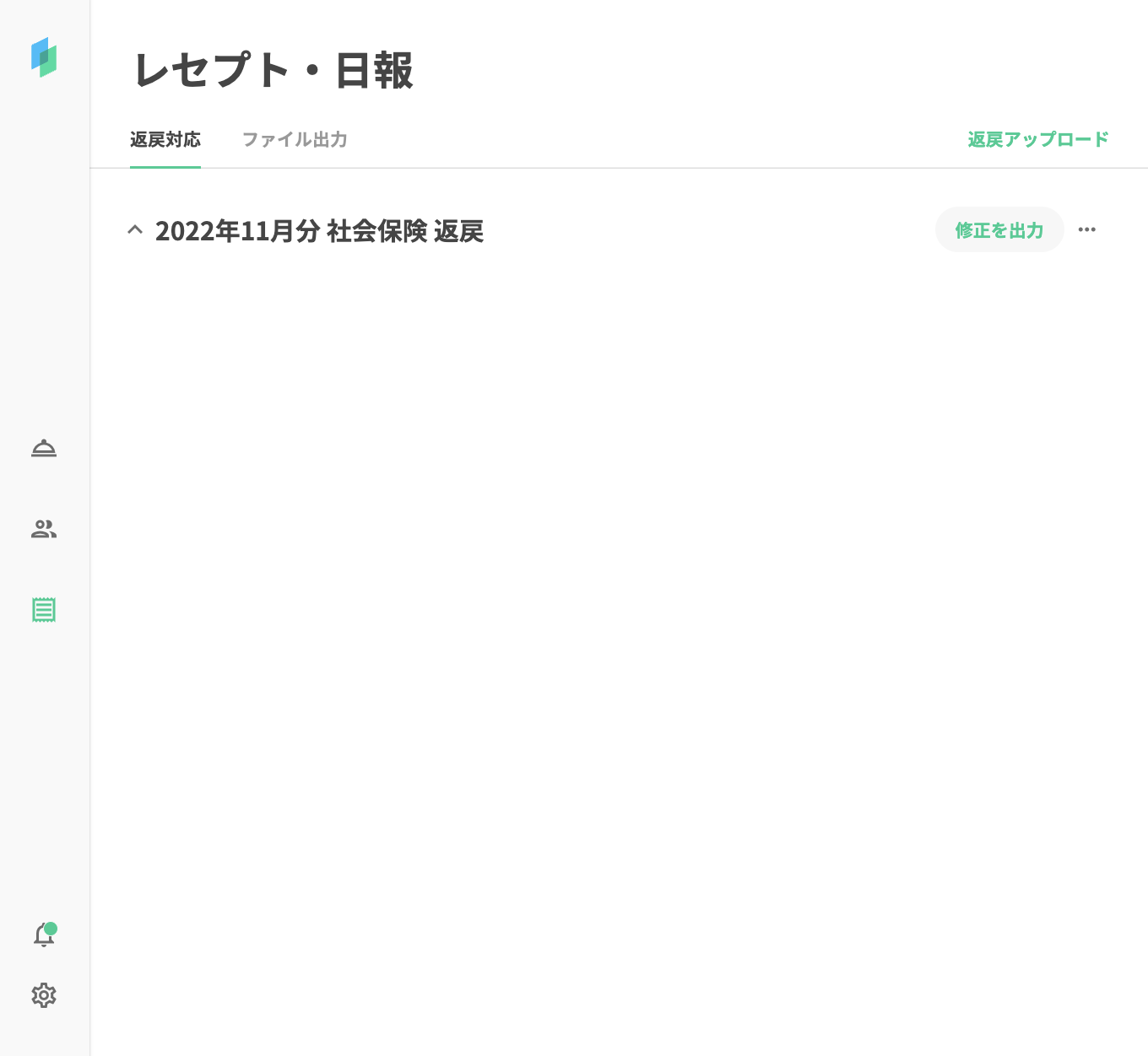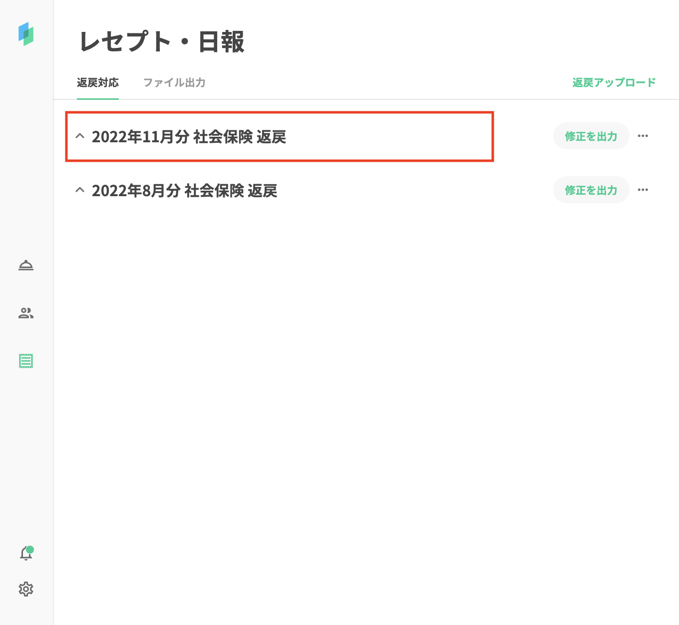 「修正を出力」が表示: 取り込みしたファイルを「提出済み」にしていない場合、表に表示されている状態です。