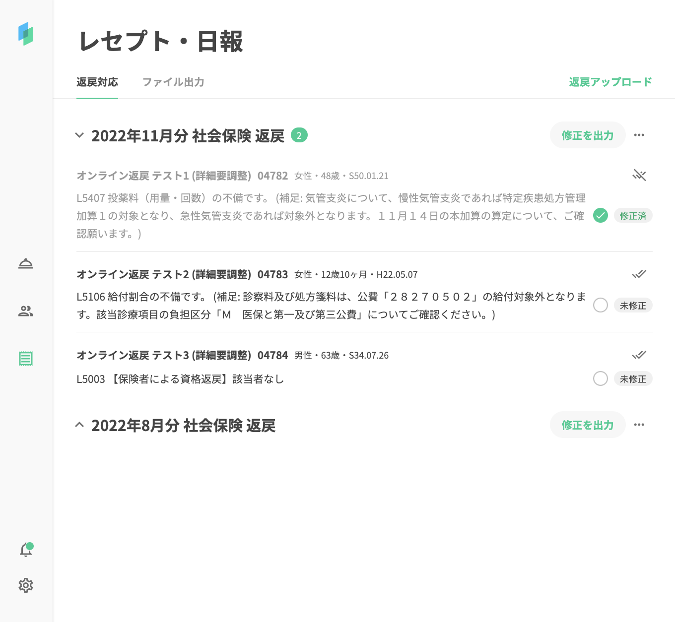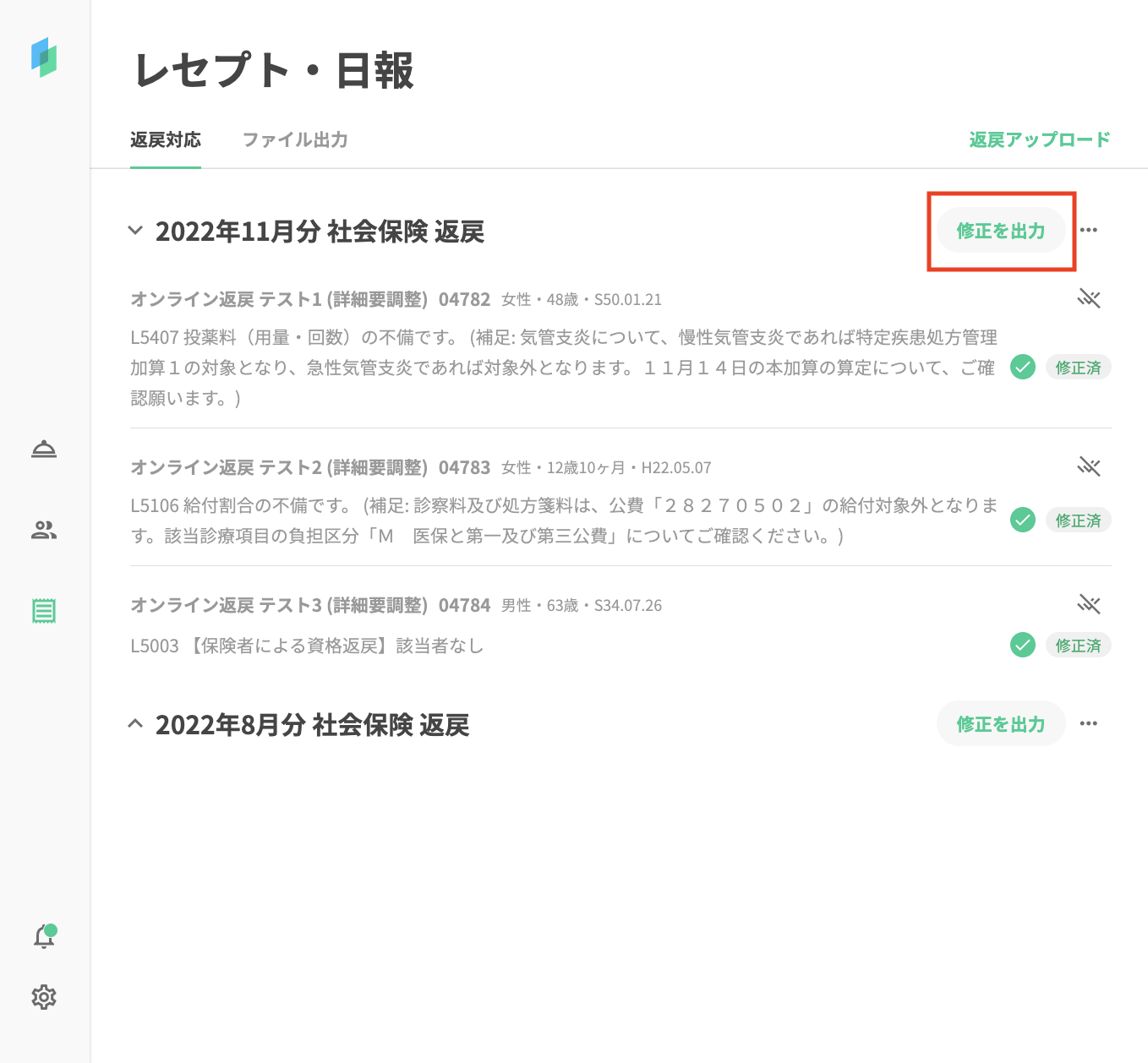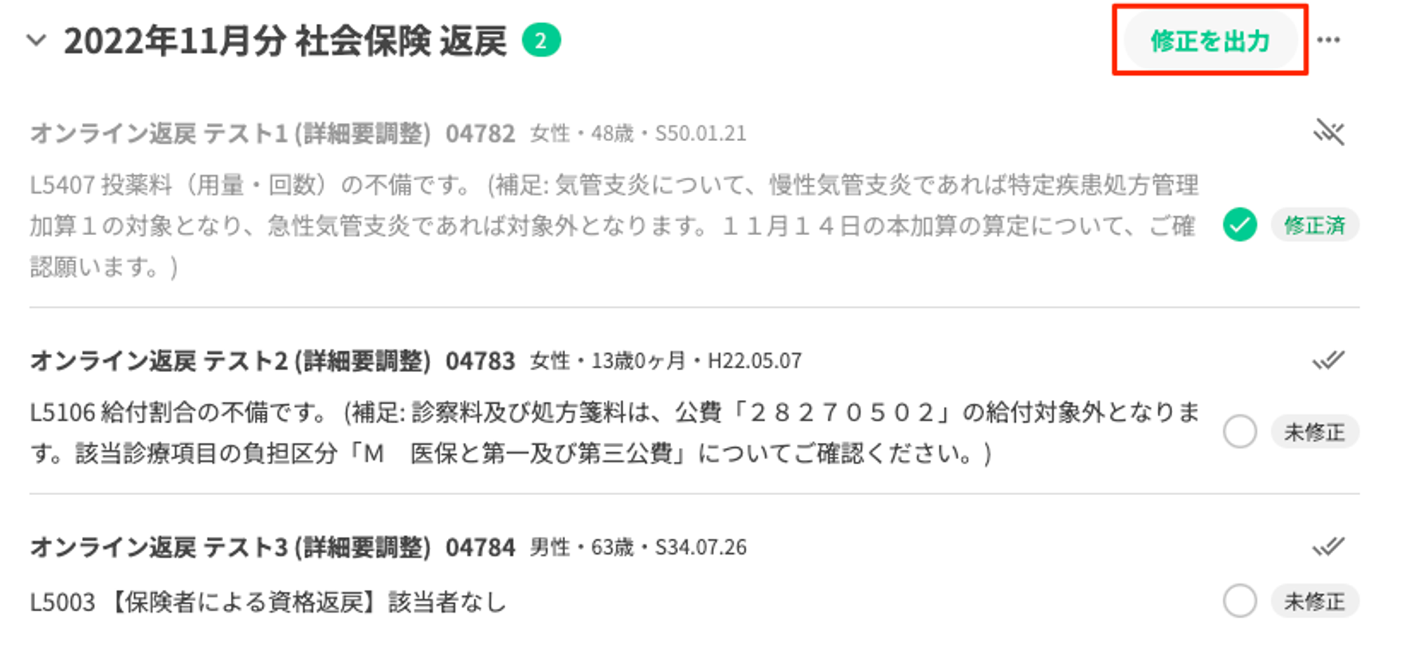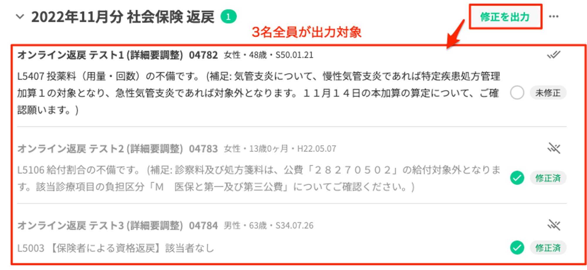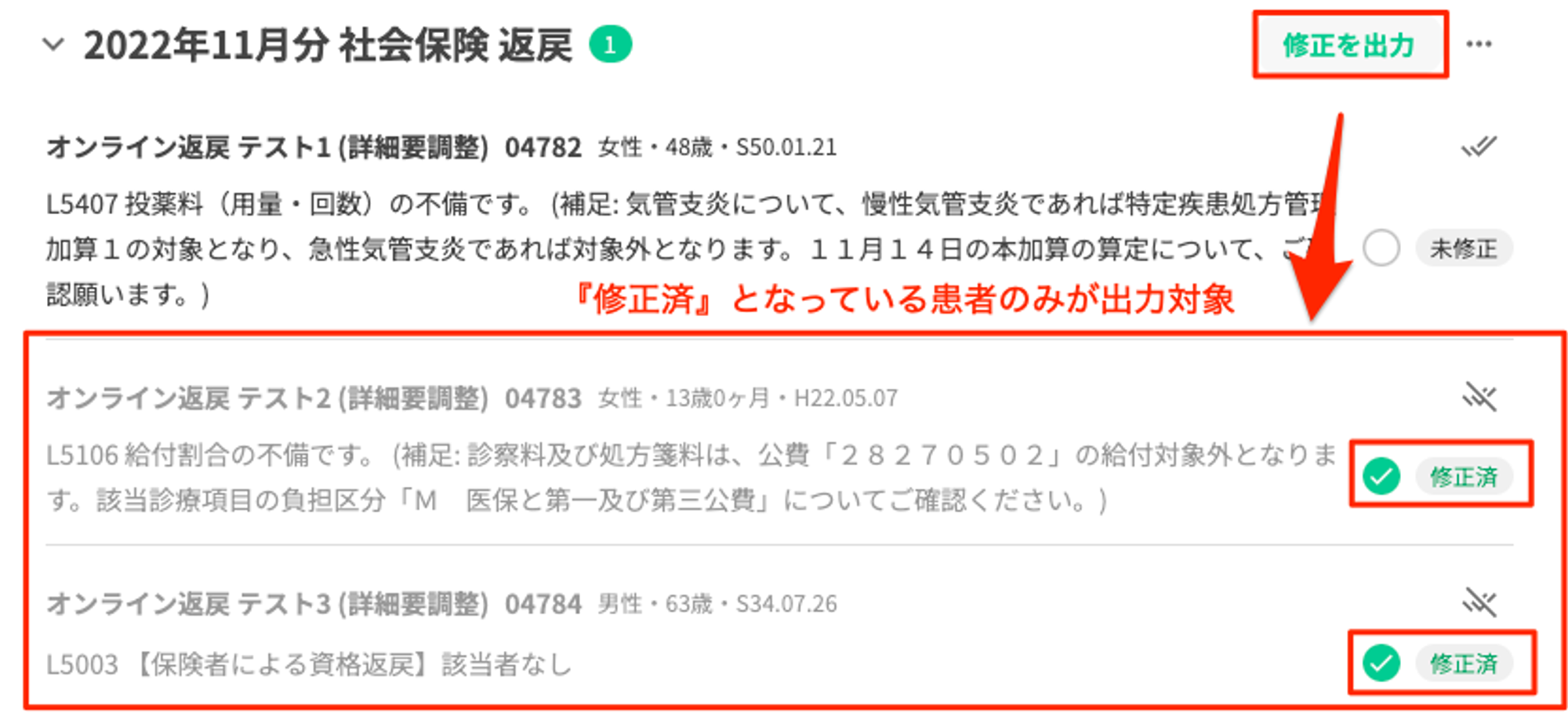 再請求用レセプトを出力する際、『修正済』となっている患者のみが出力対象となります