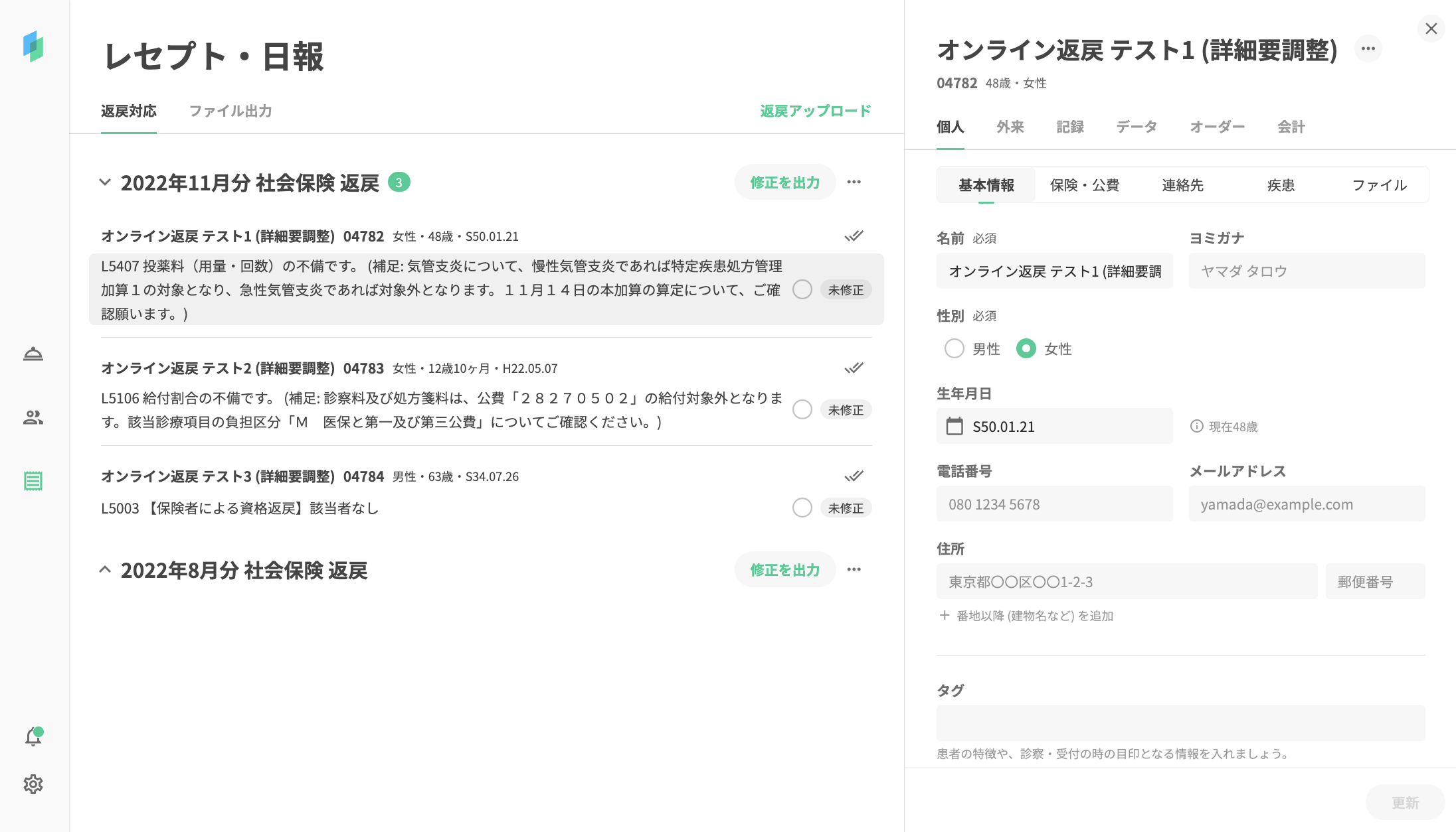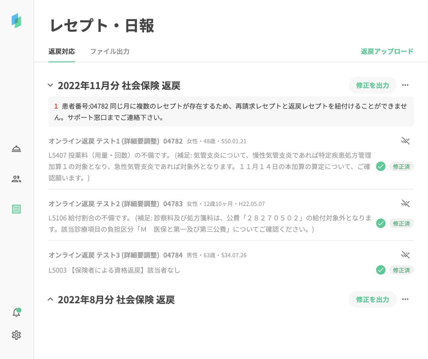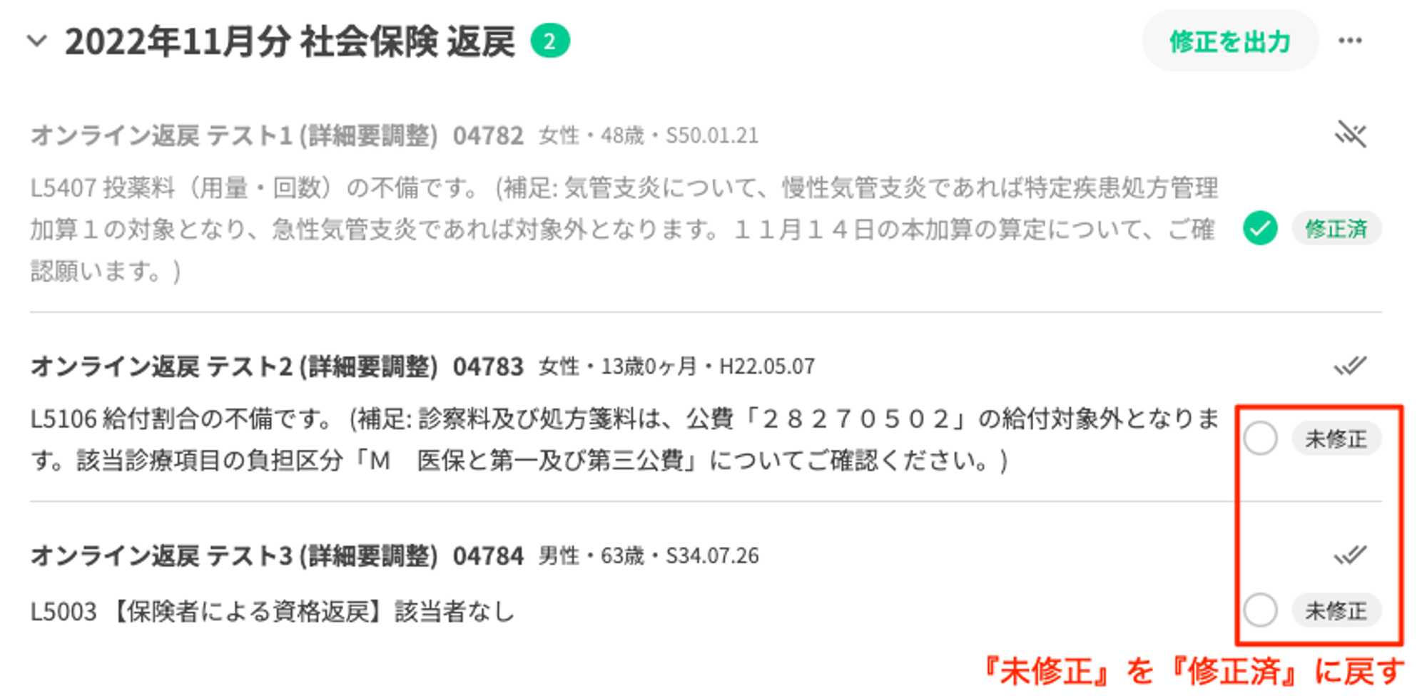 ⑤ 修正が必要な箇所が、下記、画像内で表示されているように表示される。 ※ 表示内容として、対象患者・修正箇所が表示される。ただし、診療に関わる修正の場合、レセプトからは、具体的に何日の診療を対象とした修正内容であるかは判断がつかない点は留意してください。