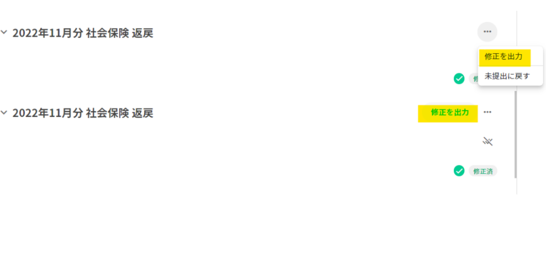 「…」リーダー内に「修正を出力」が表示: 「提出済み」にした場合はセクション全体が格納表示になり「修正を出力」ボタンが「…」リーダーの中に隠れます。 そのため、「…」リーダの中に「未提出に戻す」も含まれます。