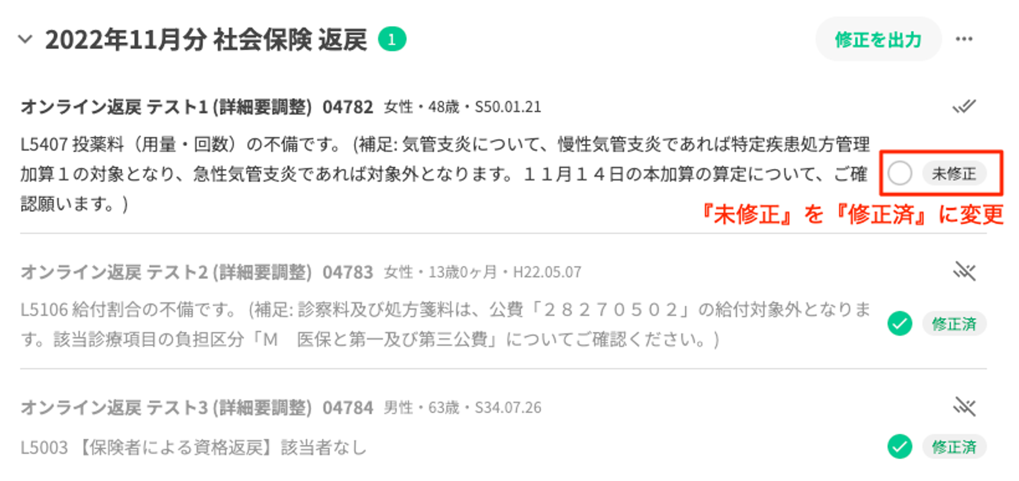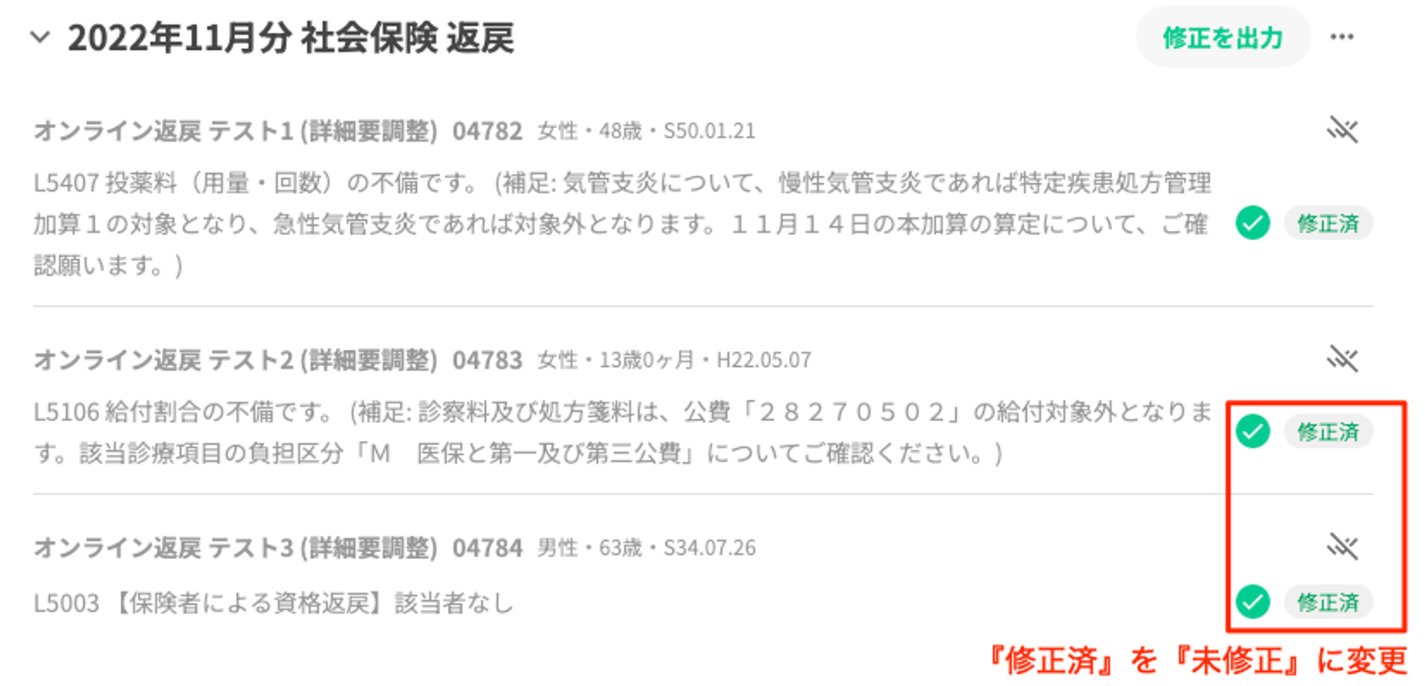 4.手順1で『未修正』にした患者を再度「修正済」に変更します