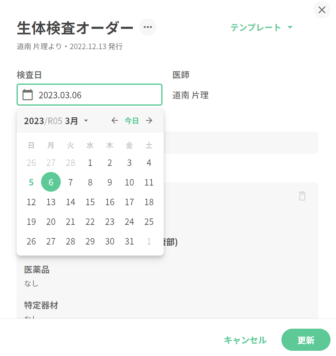 承認、もしくは受諾された実施日が”未定”の「準備中」オーダーは、スタッフ及び医師が実施日を入力すると「有効」ステータスとなる
