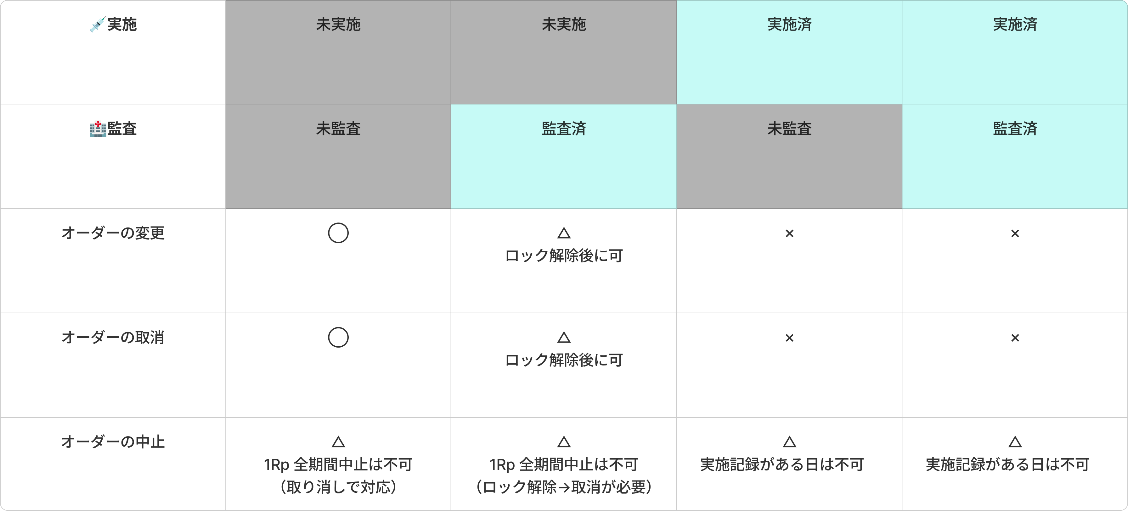 オーダーに対して実施記録が1件でも登録されると、そのオーダーは実施済としてロック状態となり、監査ロックの有無に関わらず、編集はできなくなります。