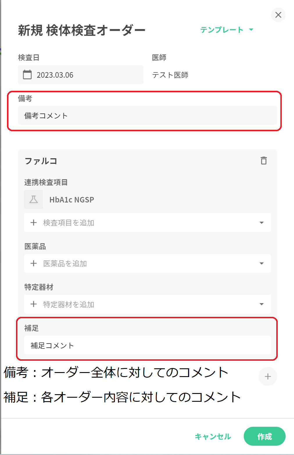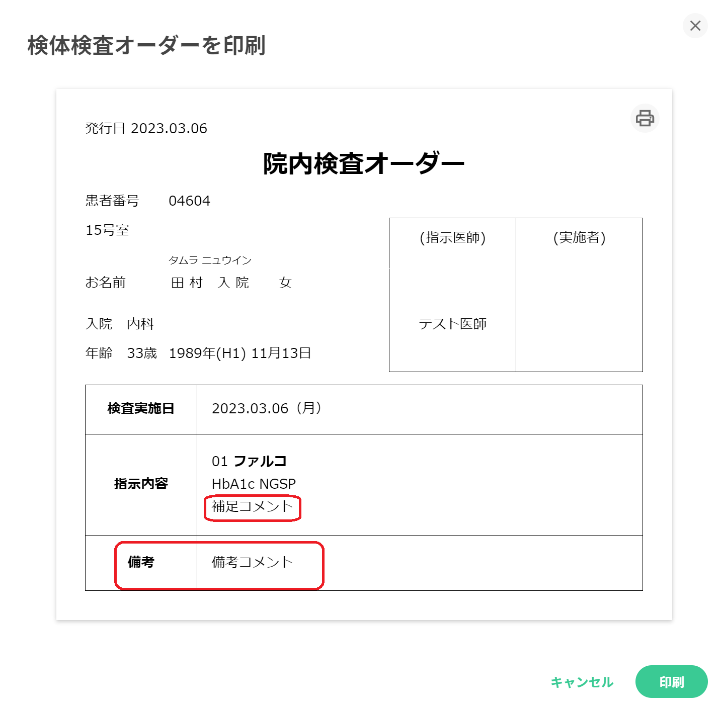 オーダー印刷画面のコメントは、以下のように印字されます。