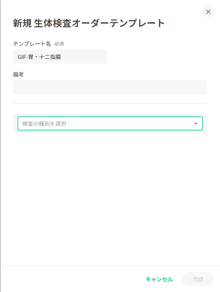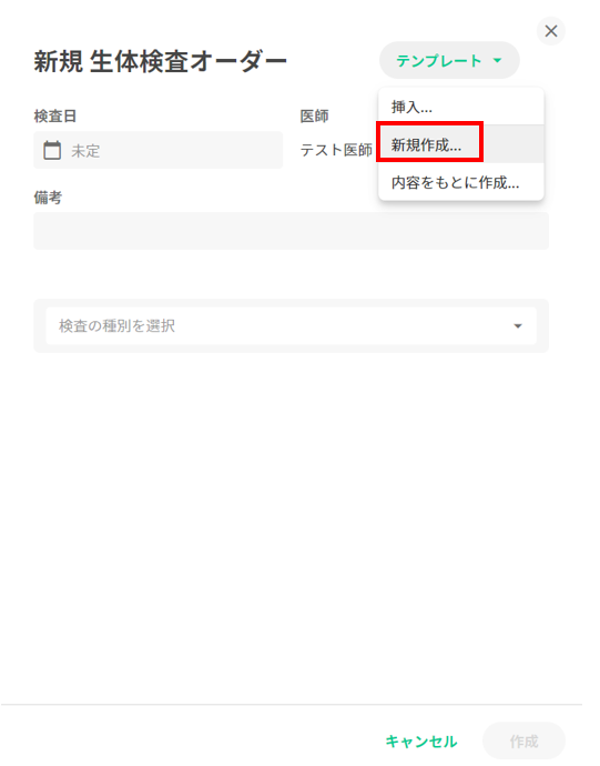 ①オーダタブの「+新規作成」から対象のオーダーを選択します(例では「生体検査オーダ」)。