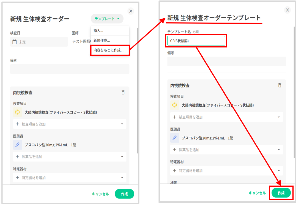 ①オーダーを入力し「内容をもとに作成...」を選択します。