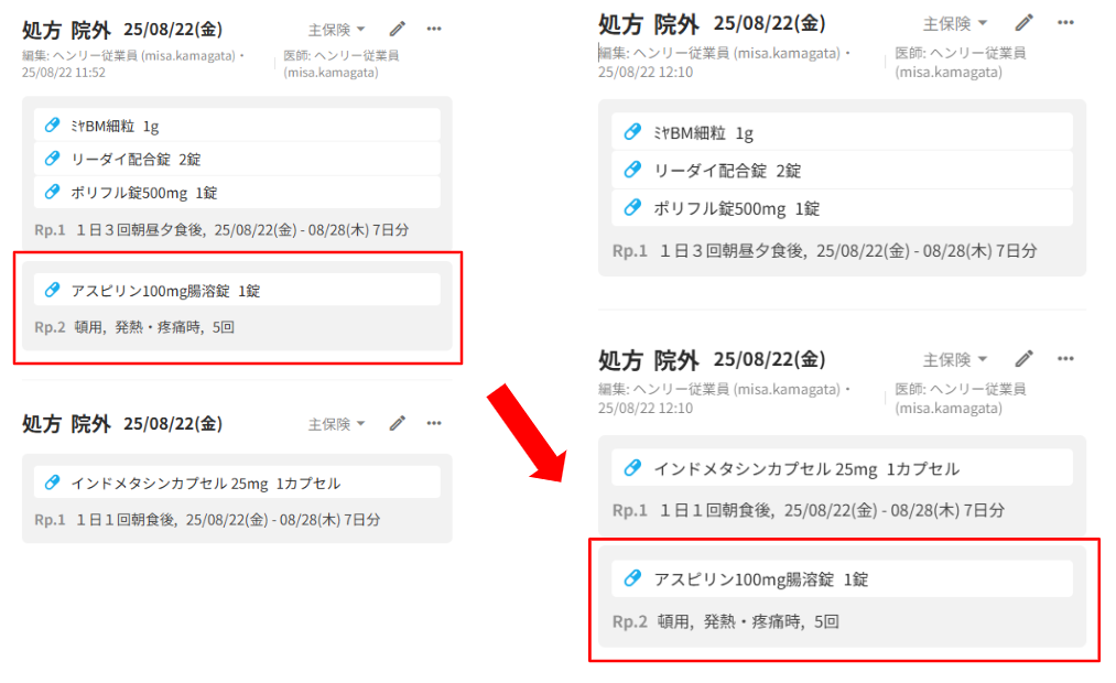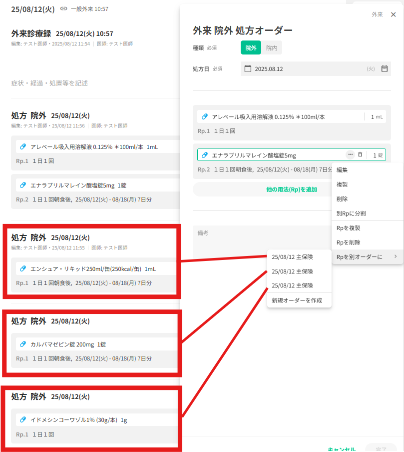 同じ日付・保険種別のオーダーが並ぶ場合は移動先が複数表示されますが、カルテの記載順とご認識ください