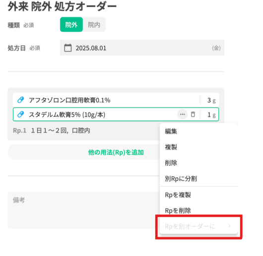 参考)【全職種】[2025/08/27] 【外来】オーダー内のグループ・Rpを別オーダーに移動させる、または別のオーダーとして分割させることができるようになります!