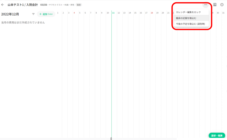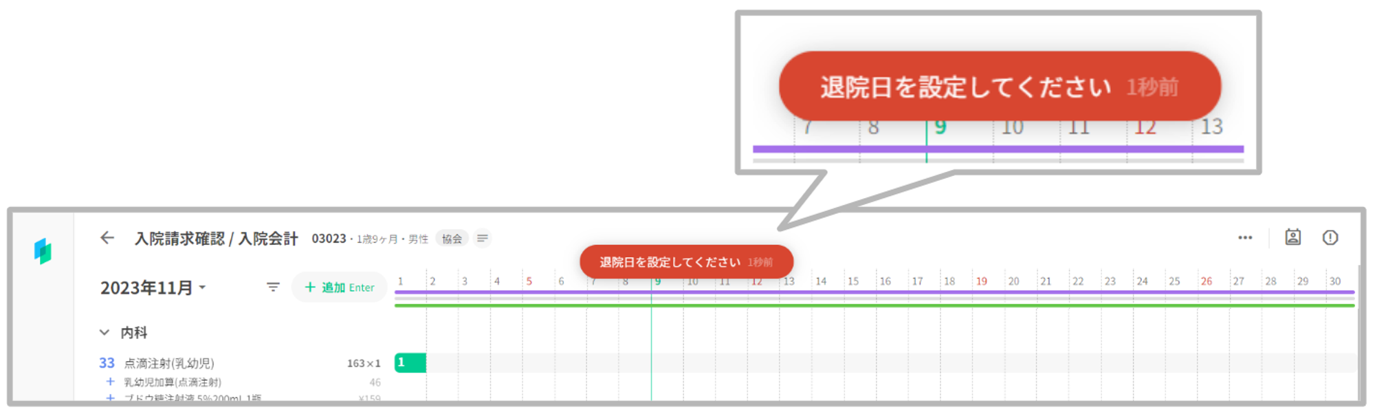 退院日または退院予定日が未設定の状態で「今後の予定を取込む(退院時)」を押下した場合:「退院日を設定してください」と表示いたします。