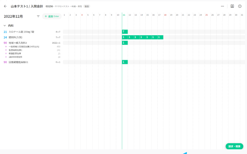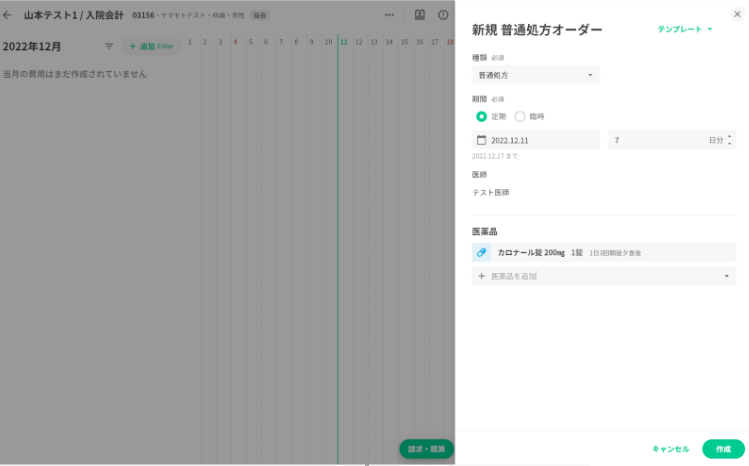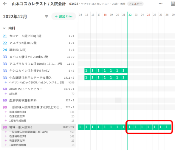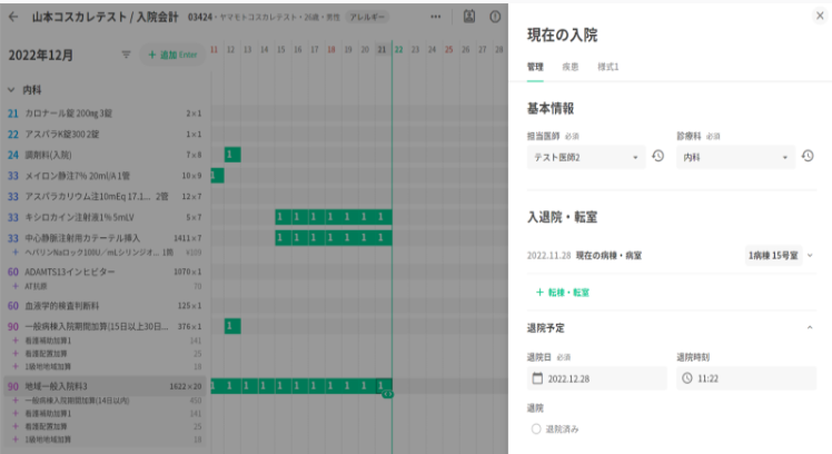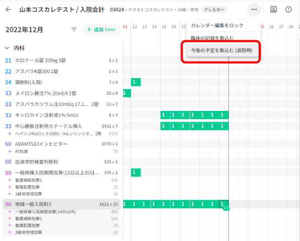 当該患者の入院情報で「退院日」或いは「退院予定日」が入力されていることを条件に、コスカレ画面上の「今後の予定を取込む(退院時)」タブをクリックすることにより、退院日までのオーダー内容のコスカレ画面への即時の取り込みが可能となります。