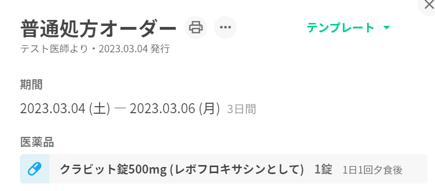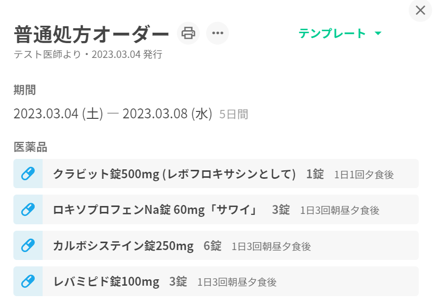 処方についてはレセプト(UKE)で処方日に日数を立てる必要が有る為、開始日付に日数分が全て連携されます(頓用・外用の場合は、それぞれ全回数分・全量分を1日として開始日に連携)。