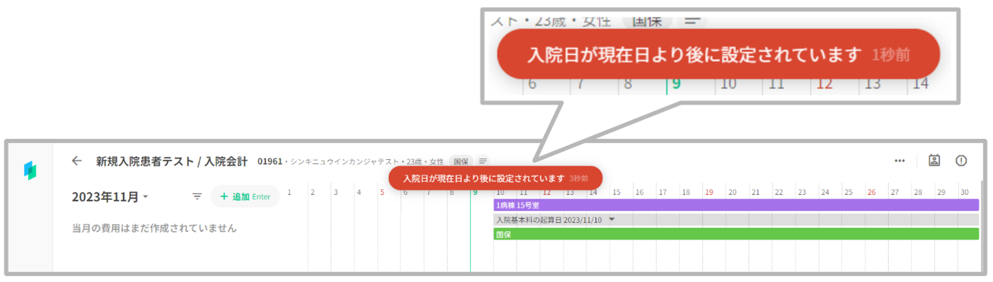 入院日が現在日時より未来で設定されている状態で「臨床の記録を取込む」を押下した場合:「入院日が現在日より後に設定されています」と表示いたします。
