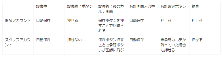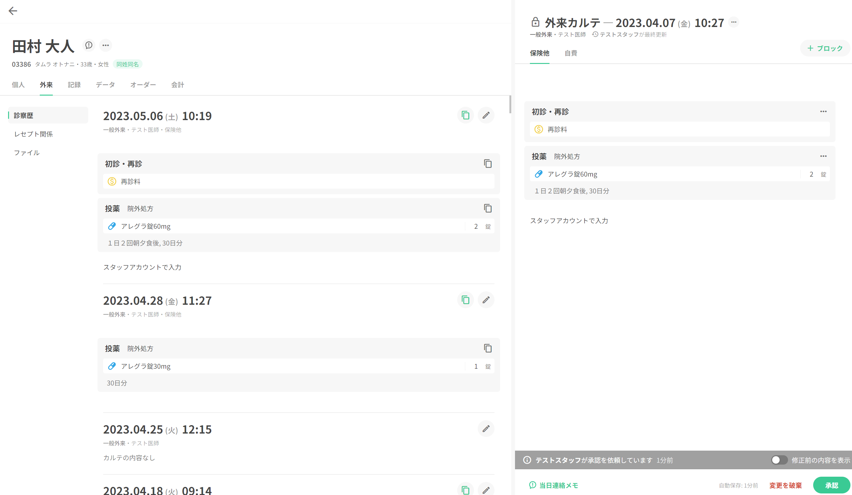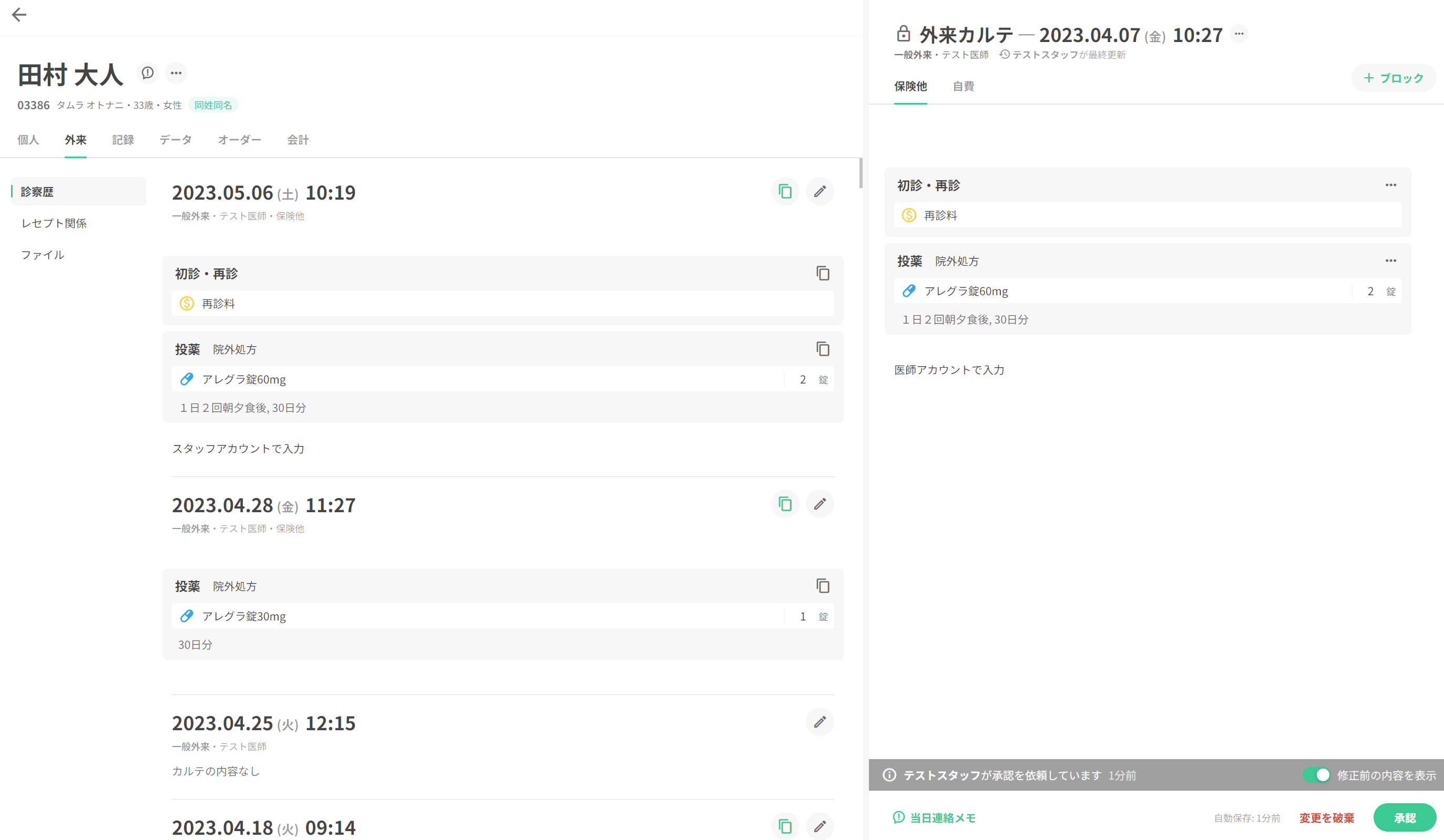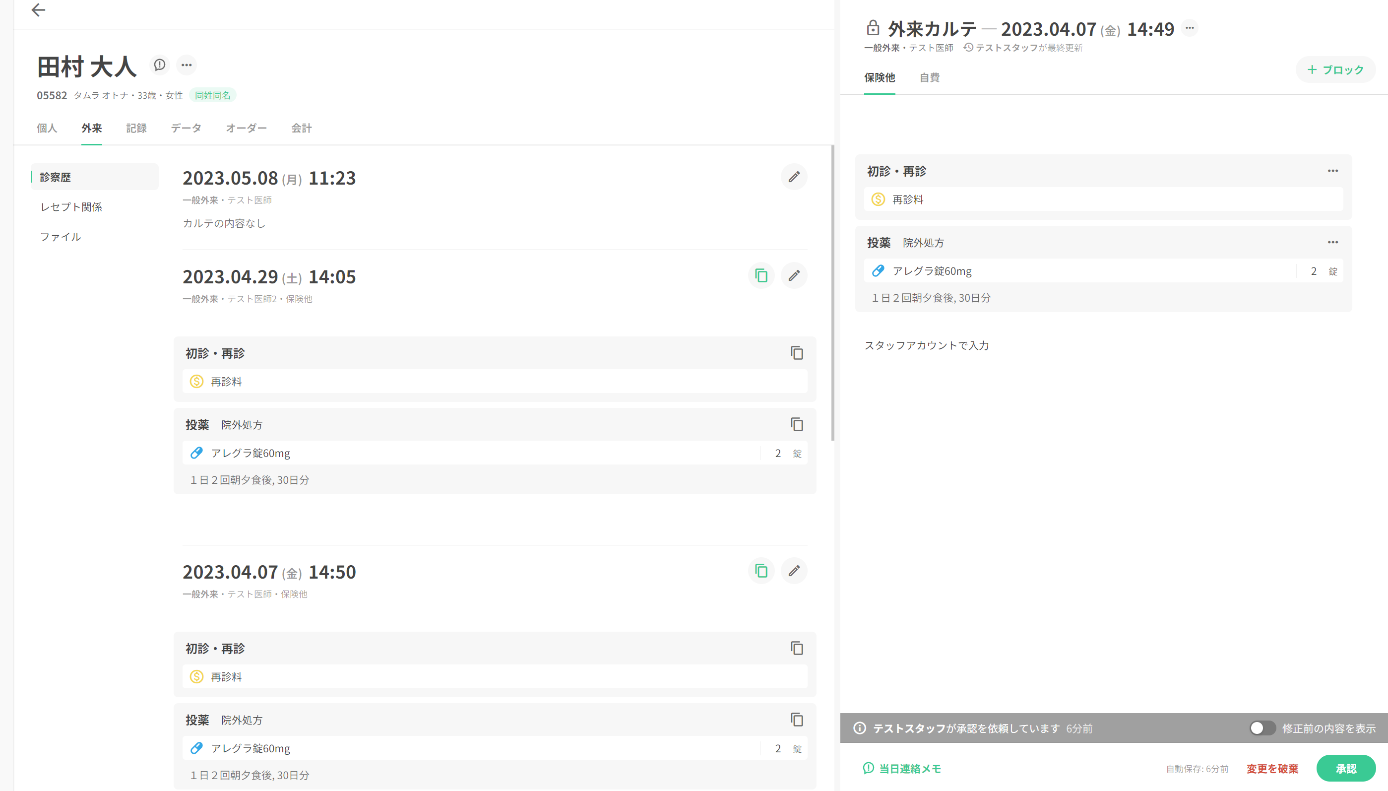 承認:スタッフアカウントで入力した会計が保存され、医師アカウントで入力したカルテは廃棄されます。