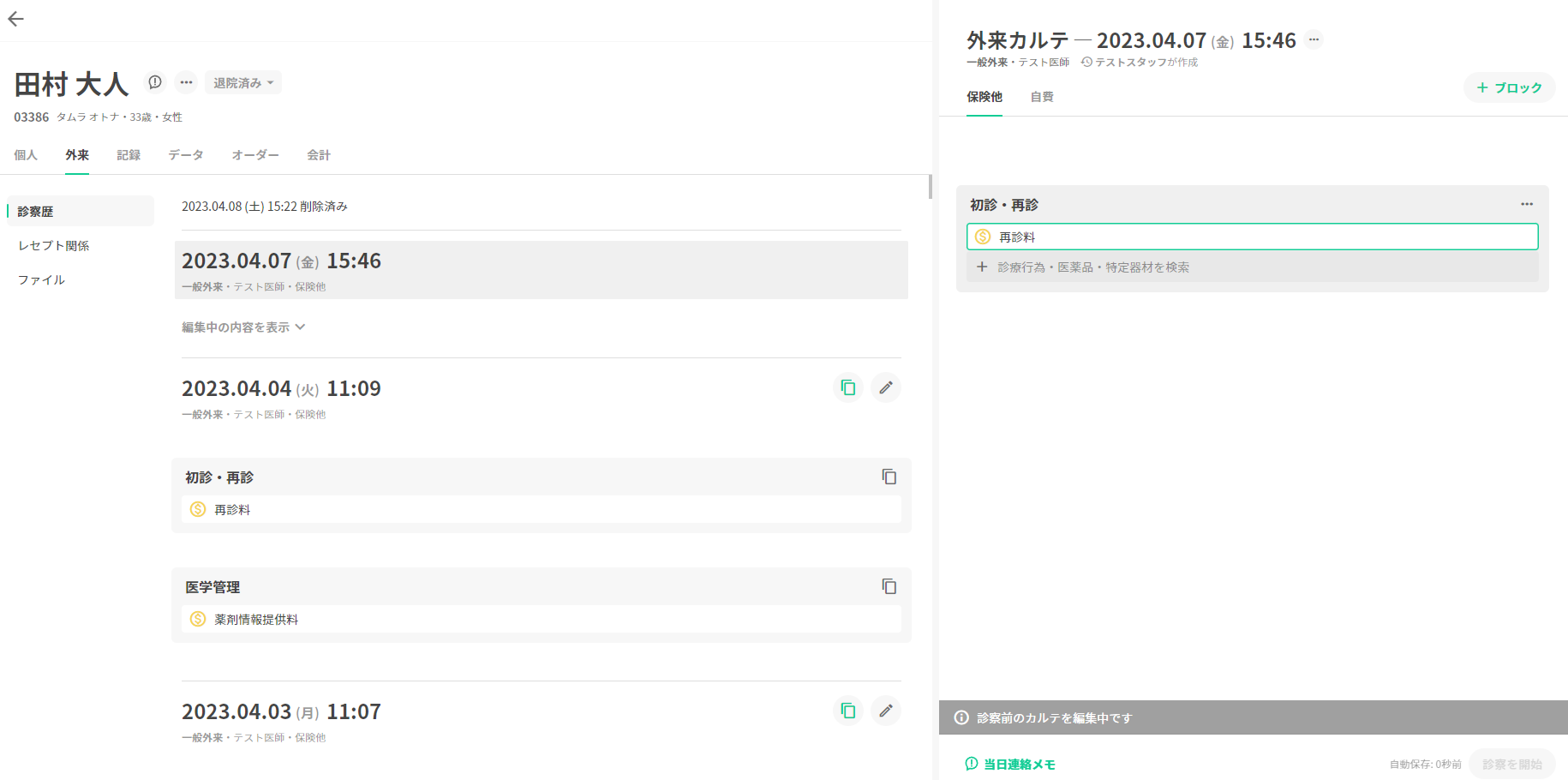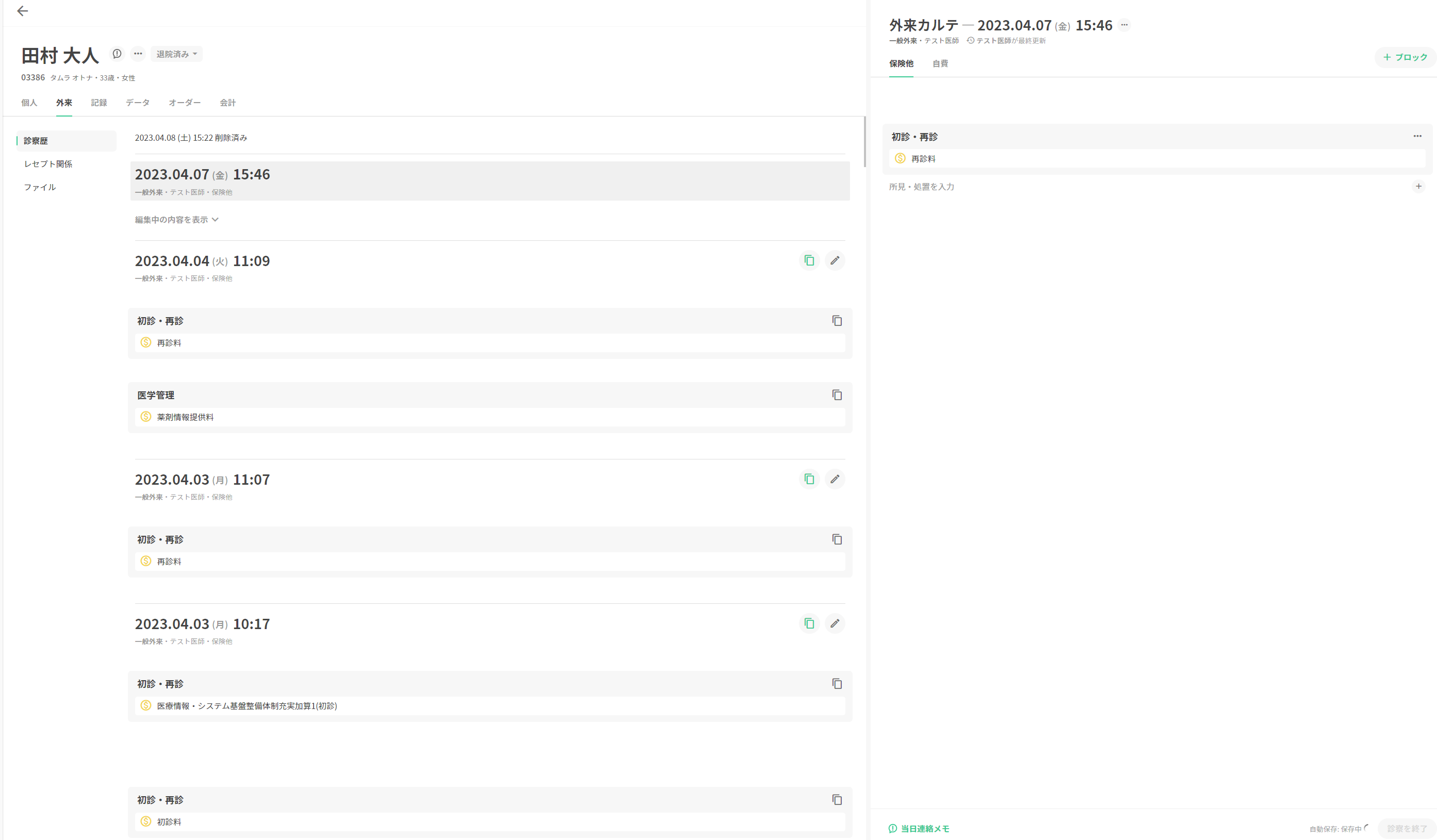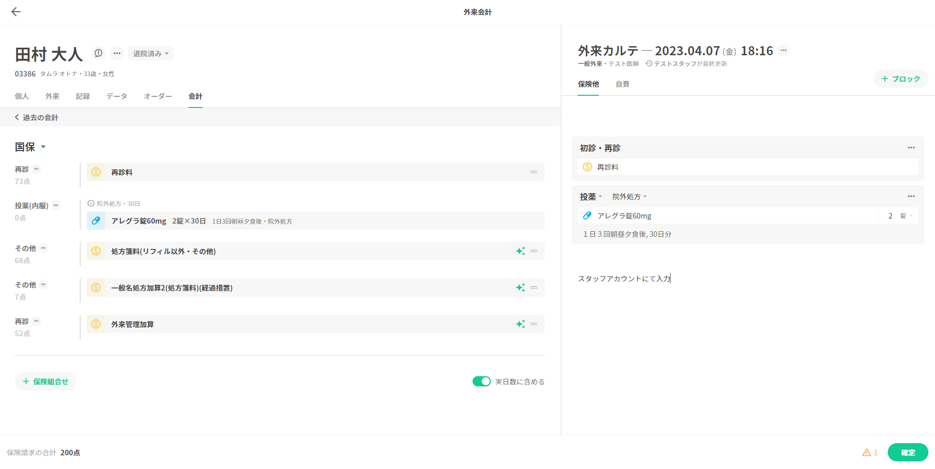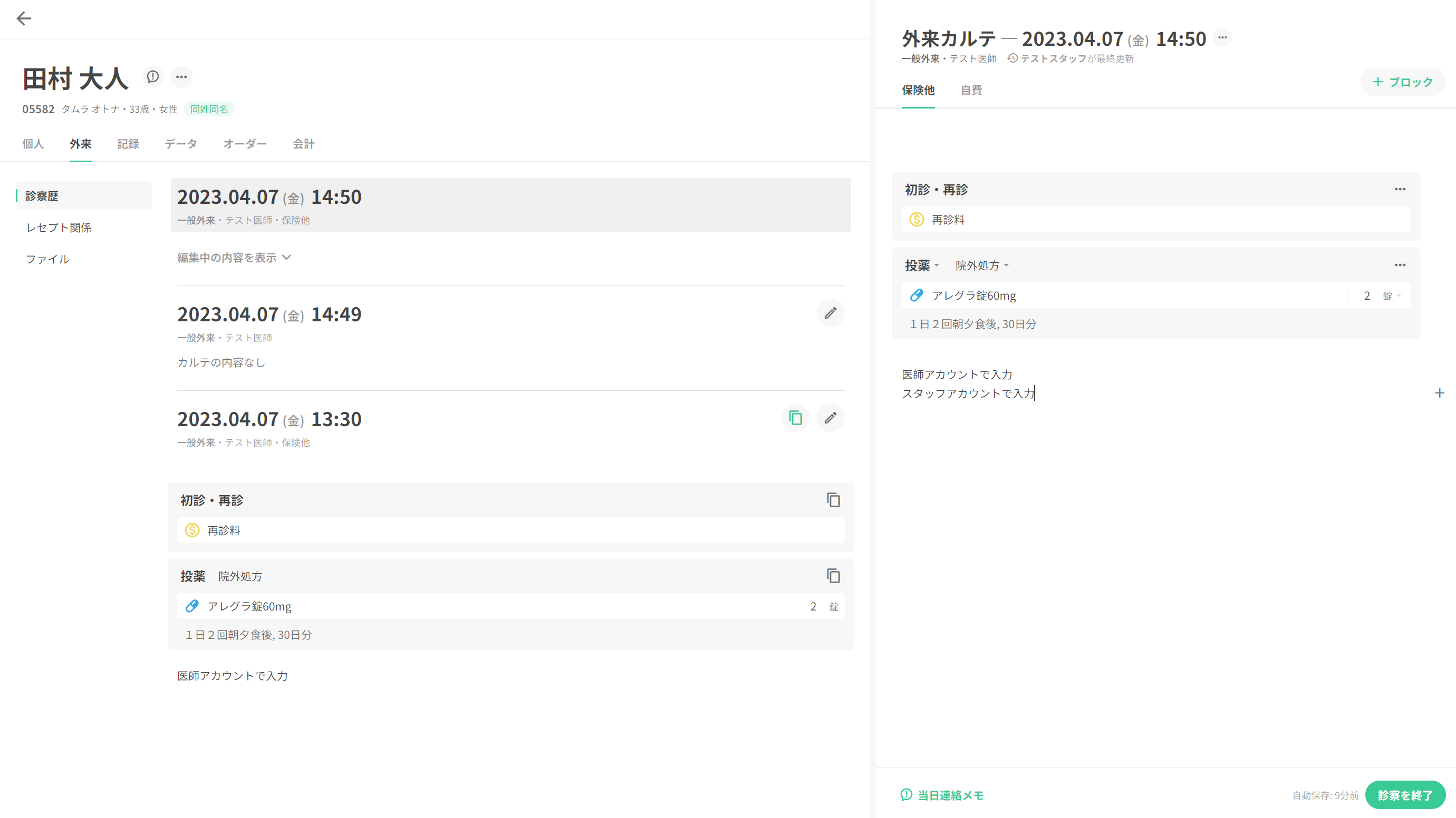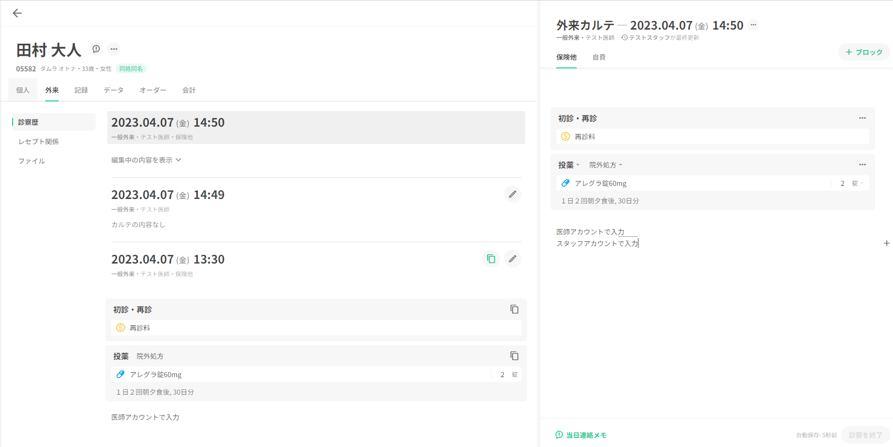 【スタッフアカウントより】カルテを閉じ、【医師アカウントにて】再度カルテを開きますと、下記のように反映されています。