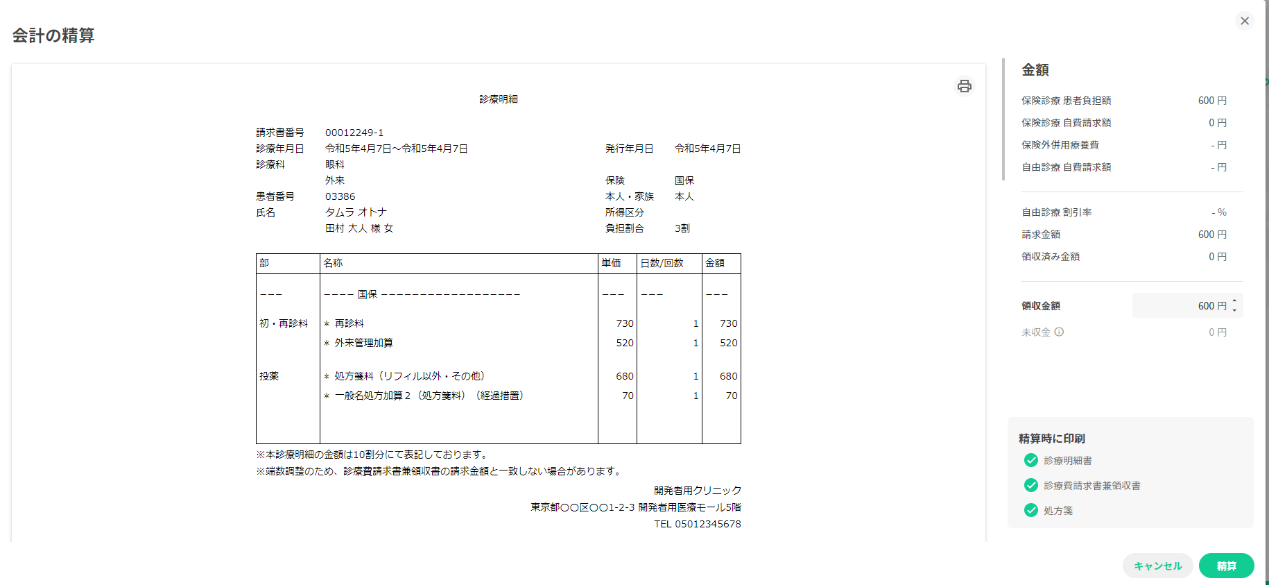 上記①の会計画面と②のカルテ、2つが存在する状態となります。