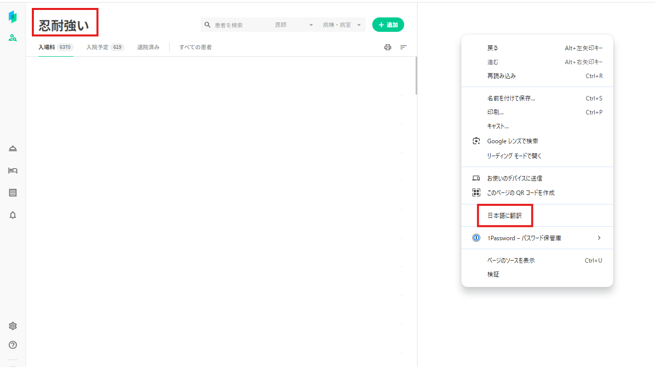 カルテ画面で右クリックし、表示されたメニューから「日本語に翻訳」を選択します
