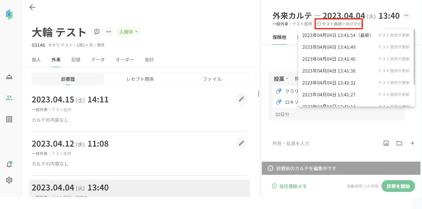 カルテ上部の日付の下にある時計マークのアイコンをクリックすると編集時間と編集者が表示され、それをクリックするとその時点でのカルテの状態が閲覧可能です。