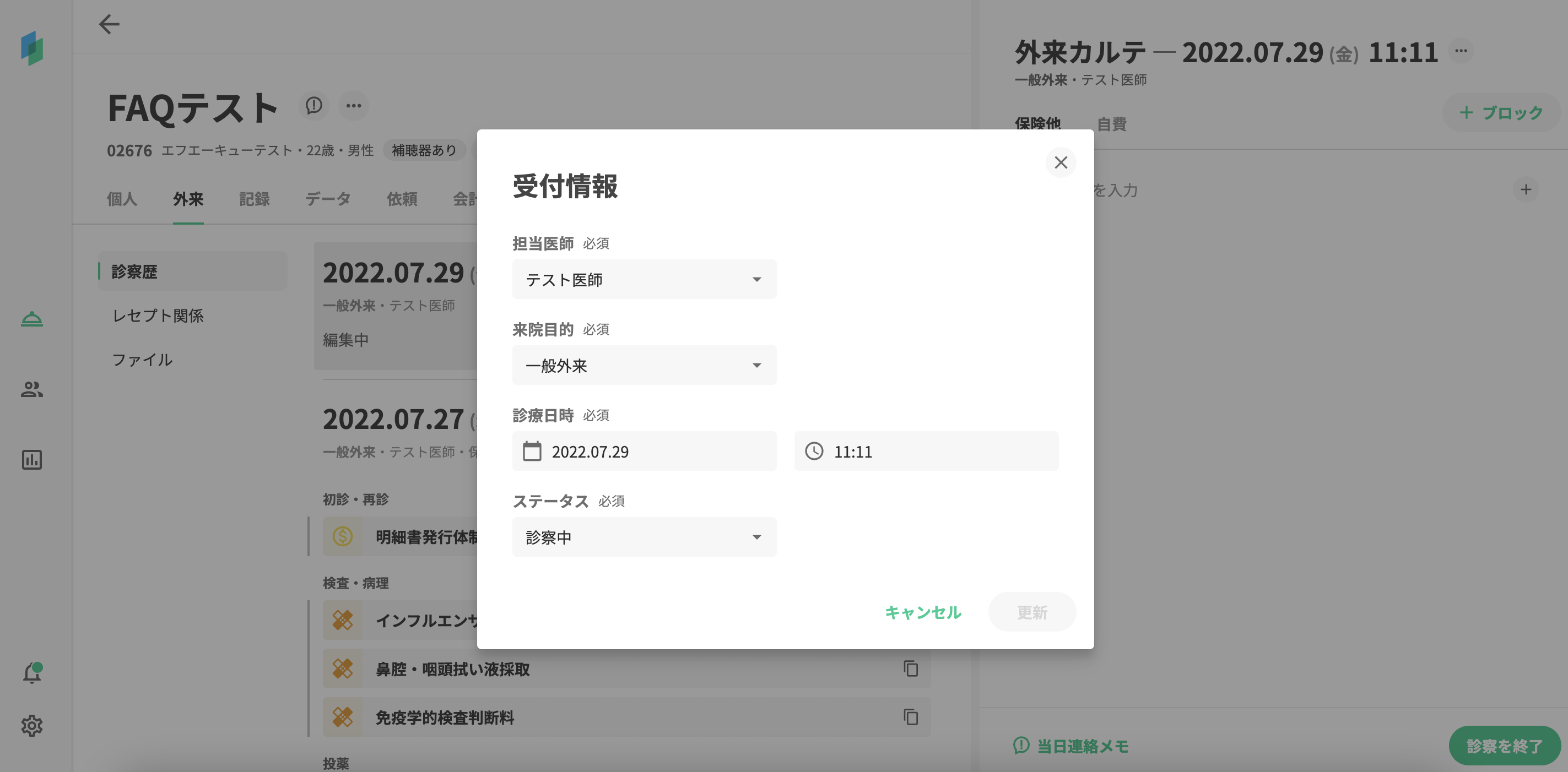 カルテ画面左上部の「患者基本情報概要」の名前部分をクリックすると、患者情報画面が開きます。患者情報の参照と編集ができます。