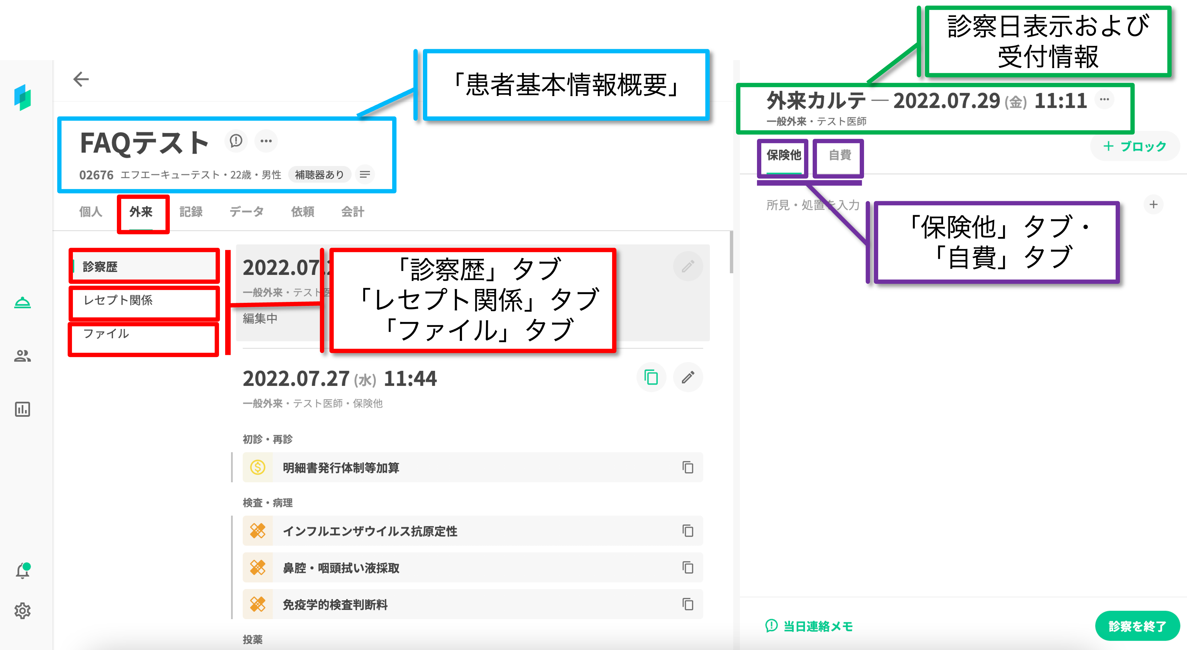 カルテ画面は、次のとおり構成されています。 - 左上方...患者情報概要 - 左中央部...「外来」タブ - 「診察歴」タブ...現在開いているカルテを含めた全診察歴が、診察日が新しい順に一覧できます。 - 「レセプト」タブ...患者の傷病名・症状詳記・レセプト摘要欄を管理しています。 - 「ファイル」タブ...患者の保険証や他院からの紹介状、検査や処置の同意書など、各種書類画像のアップロードや参照ができます。 - 右上方...診察日表示および受付情報を閲覧できます。 - 右中央部...カルテ編集画面(カルテの本文を記載することができます。) - 「保険他」タブ...保険診療のカルテを記載します。 - 保険診療...保険証忘れや無保険で自費計算した場合も含む - 保険外併用療養...保険診療に付随して発行する診断書や差額ベッド - 「自費」タブ...自費診療や労災・自賠のカルテを記述します。 - 自費診療...美容形成のように保険適応にならない自由診療 - 労災・自賠...保険請求する自賠(保険自賠、第三者行為)や保険請求する労災もこちらに記載する