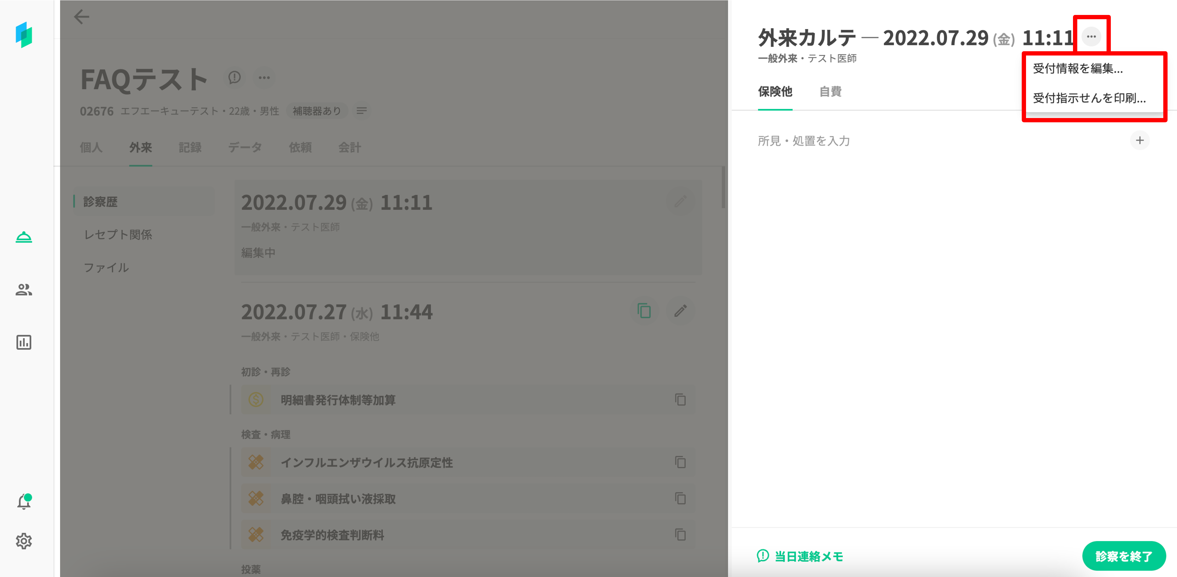 画面右上の受付日時の右側にある「・・・」をクリックして、「受付情報を編集」を選択すると、受付情報編集画面が表示されます。