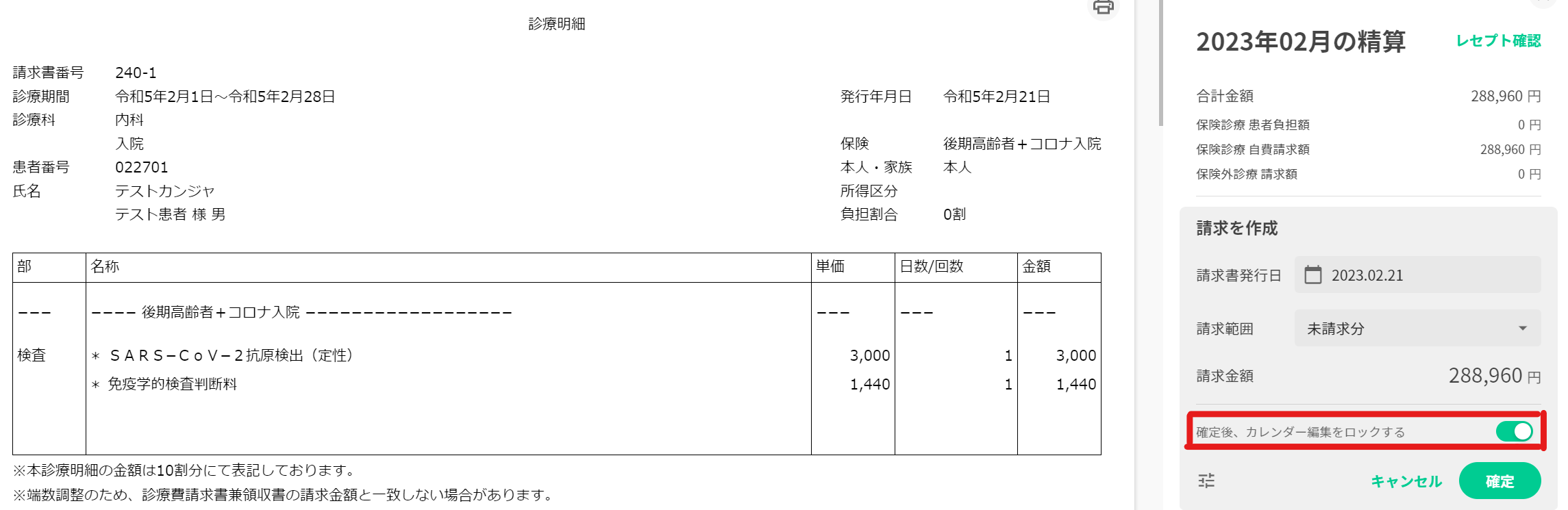 請求作成時に「確定後、カレンダー編集をロックする」のタブを押して確定をすると、コスカレがロックされます。
