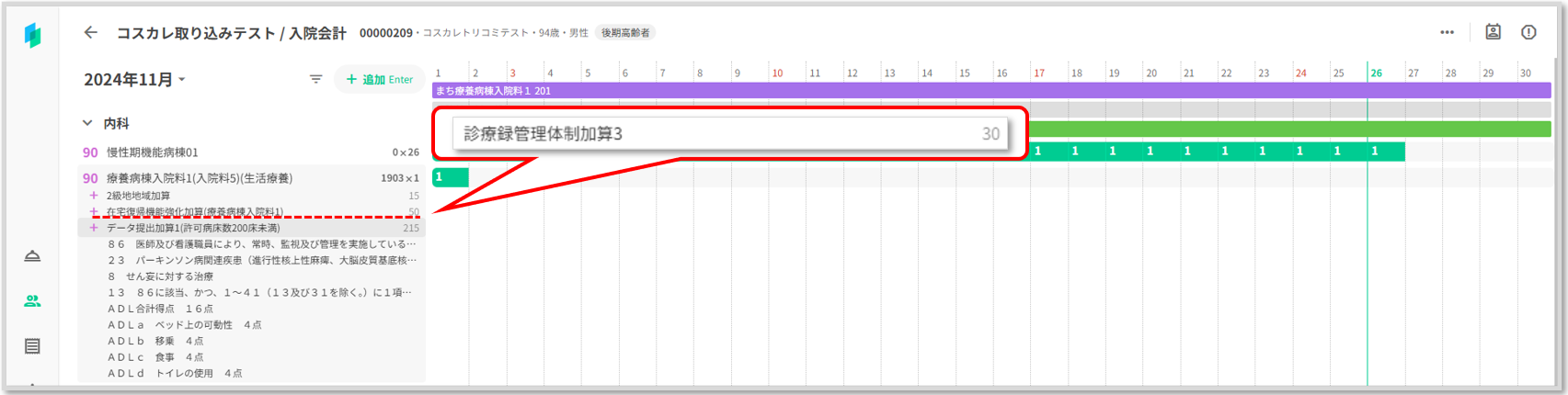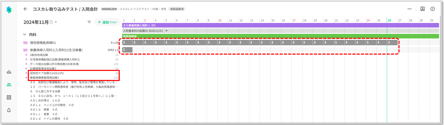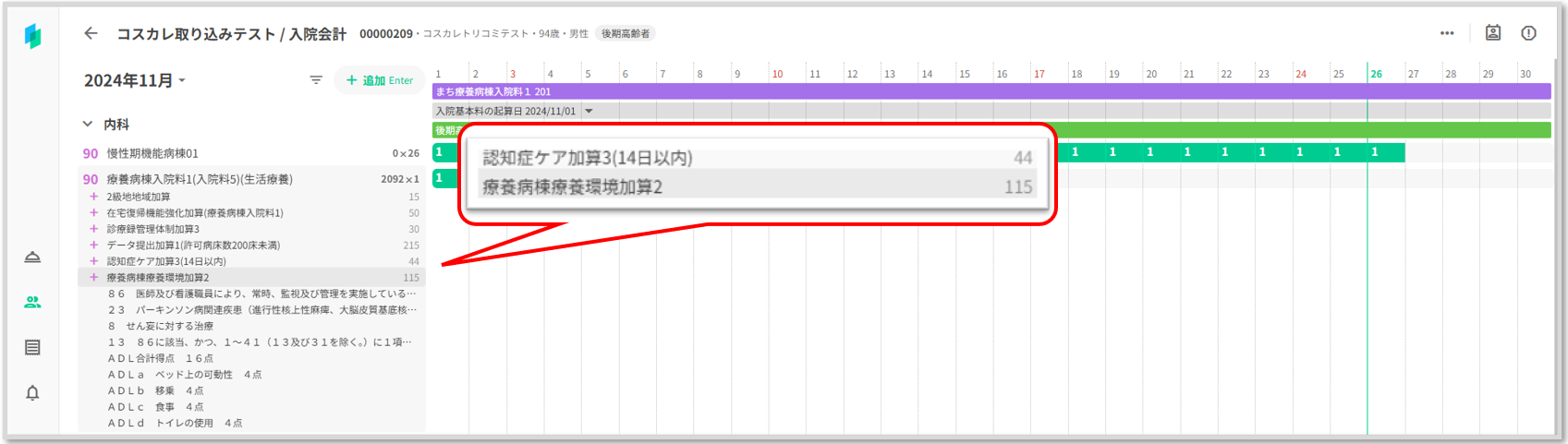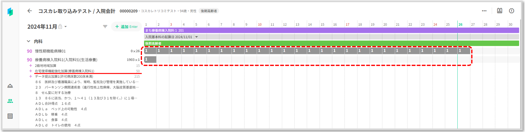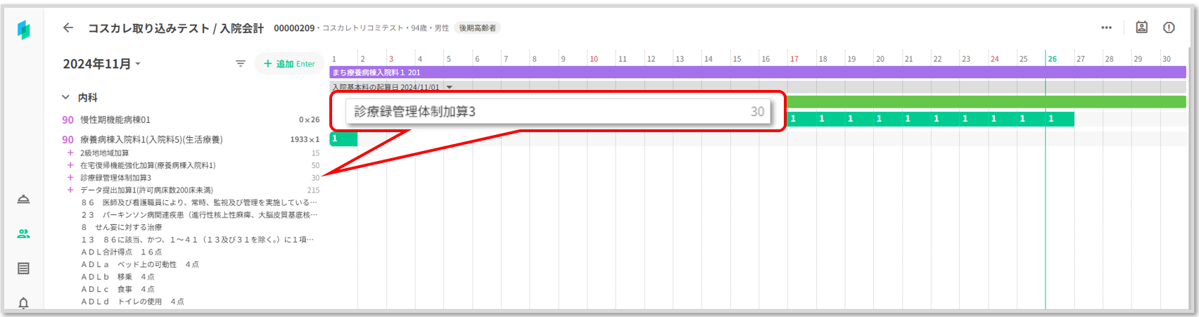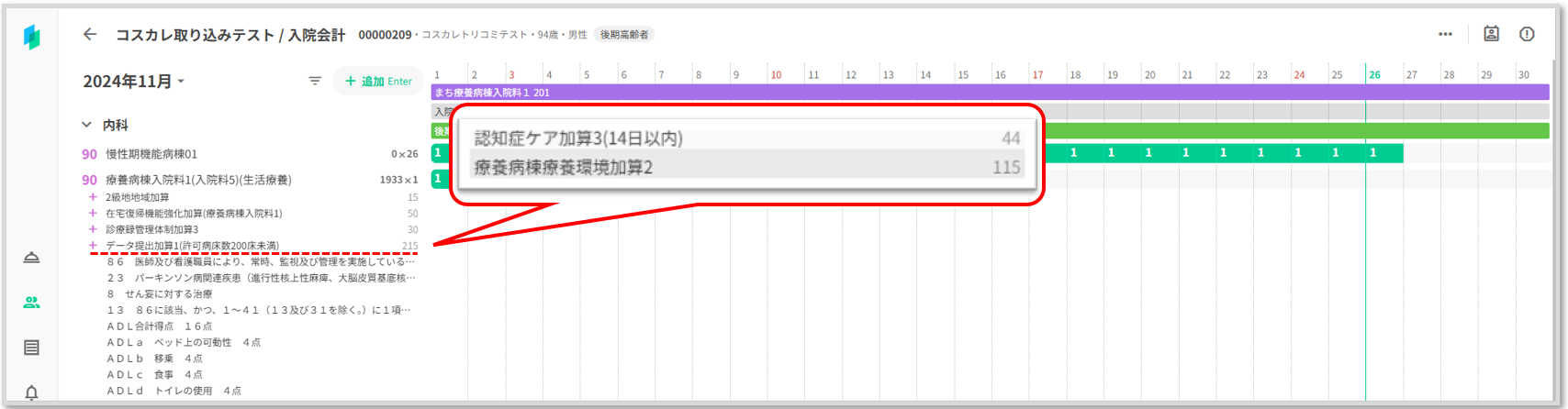 コスカレがロックされコストがグレー表示されます。コスカレに手入力した「認知症ケア加算3」「療養病棟療養環境加算2」が削除されず表示されています。