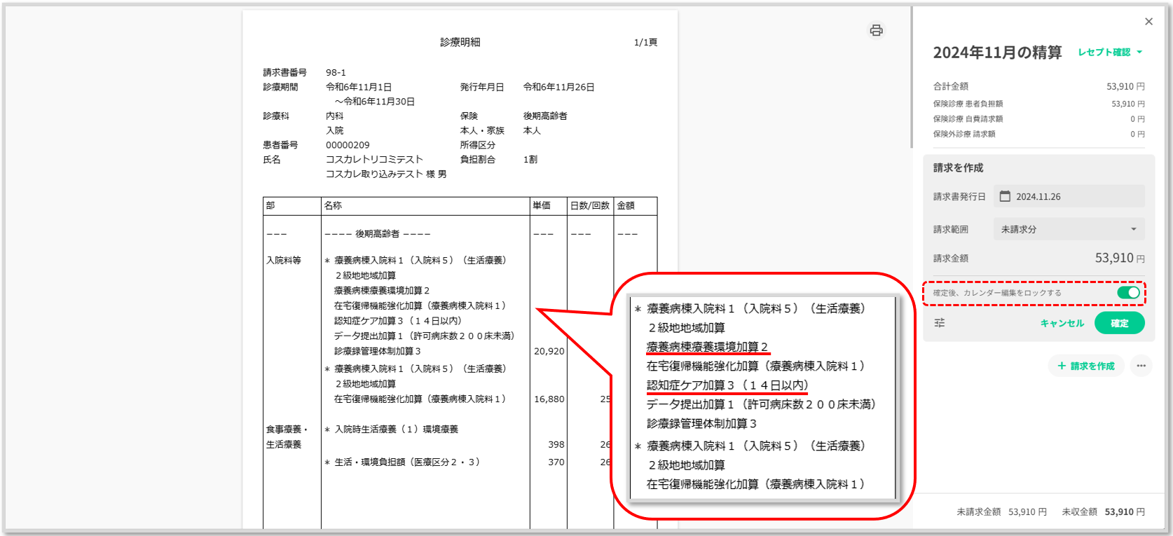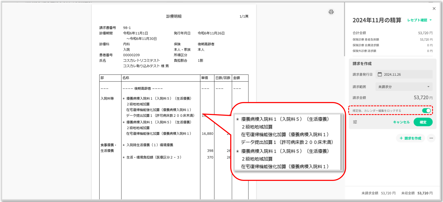 診療明細にも表示されています。「確定後、コストカレンダーをロック」をonにして「確定」ボタンを押下してもコスカレがロックされます。