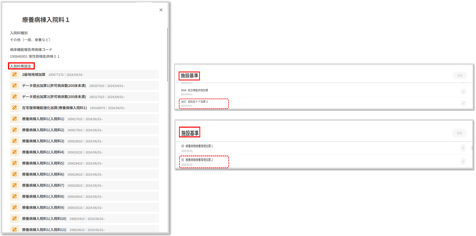施設基準に登録されている「認知症ケア加算3(14日以内)」と「療養病棟療養環境加算2」をコスカレに手入力します。(入院料等設定には入っていない)