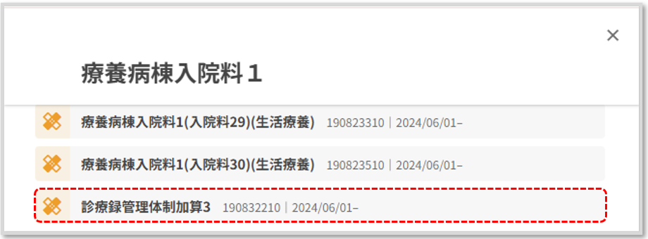 月末や退院時など入院料を確定する際に、他のコスト追加や削除した内容の再確認の上「診療録管理体制加算3」をコスカレから削除します。
