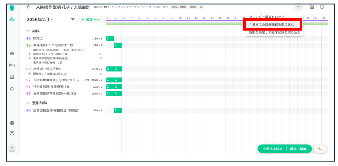 「今日までの臨床記録を取り込む」または「期間を指定して臨床記録を取り込む」を押下します