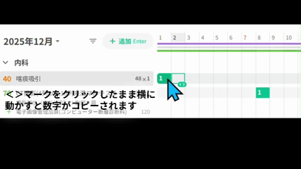 算定回数はカレンダー部分で編集します。<>マークをクリックしたままマウスを横に動かすと、数字がコピーされます。空欄で<>マークをクリックしたまま動かすと、空欄(0回)がコピーされます。