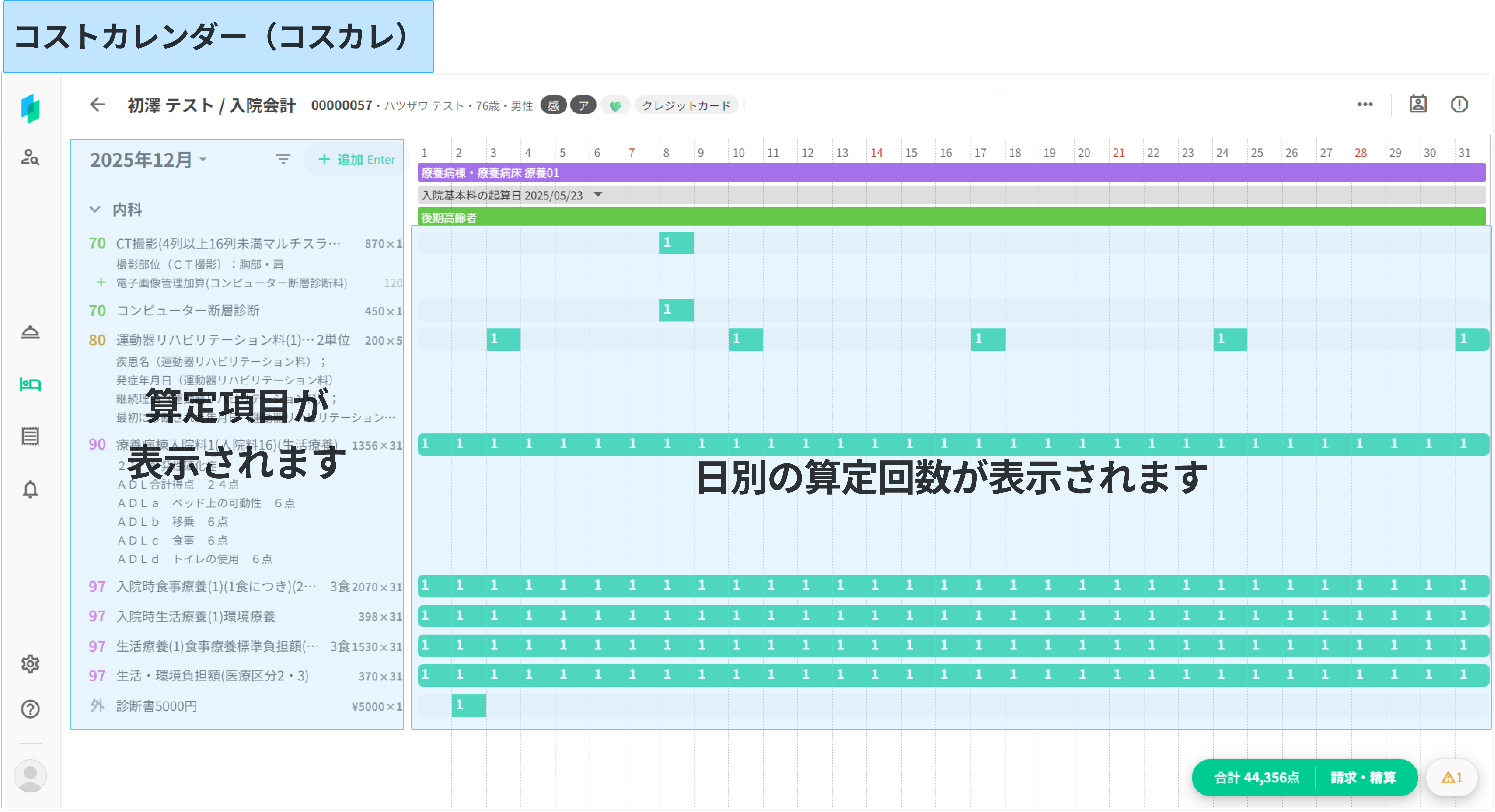 コスカレを開くと、左側に算定項目と点数(金額)が診療識別順に表示され、カレンダー部では日別の算定回数が緑色で表示されます。