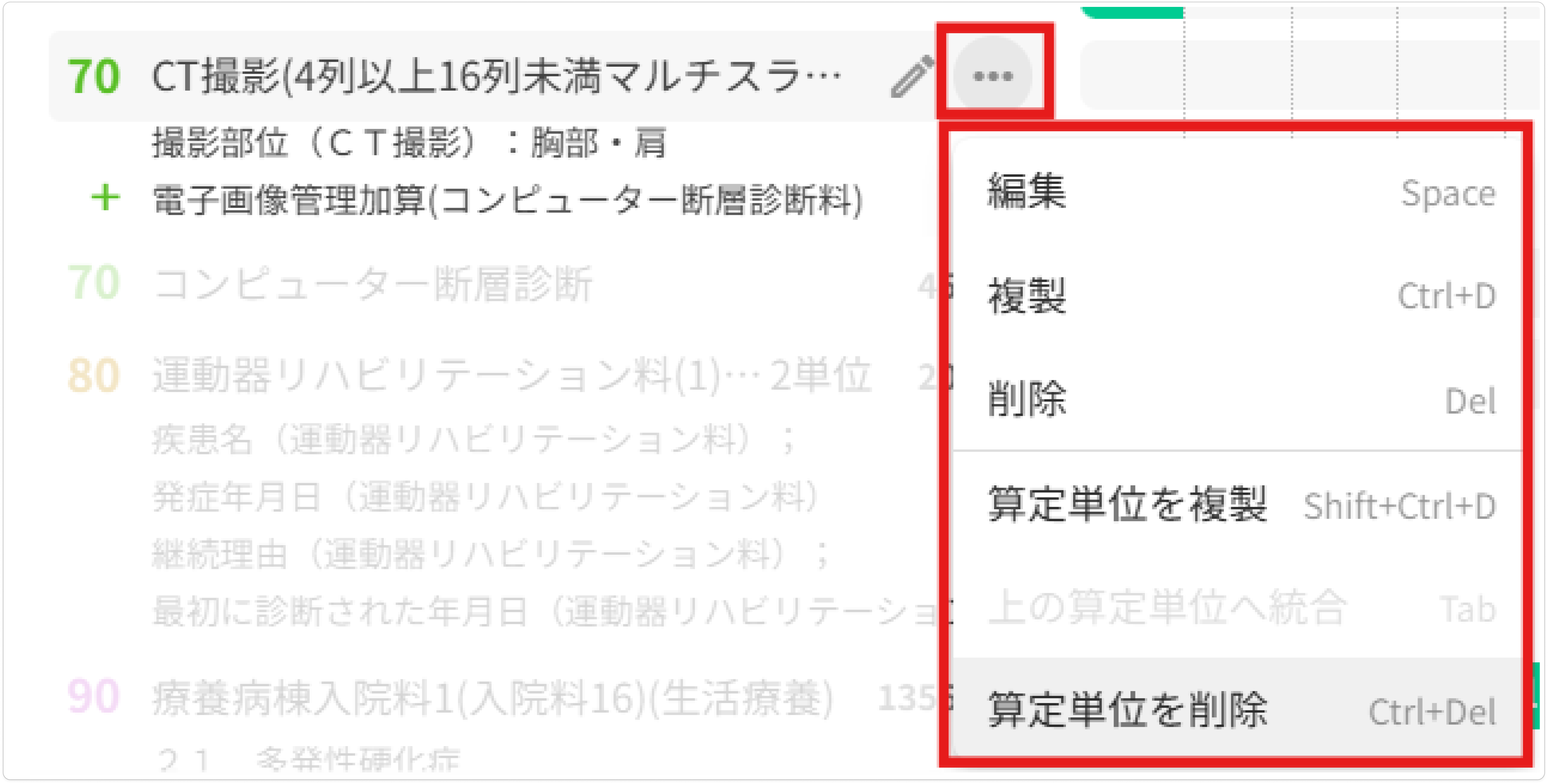 [⋯]ボタンより、複数の算定項目がまとまった算定単位を分割することができます。