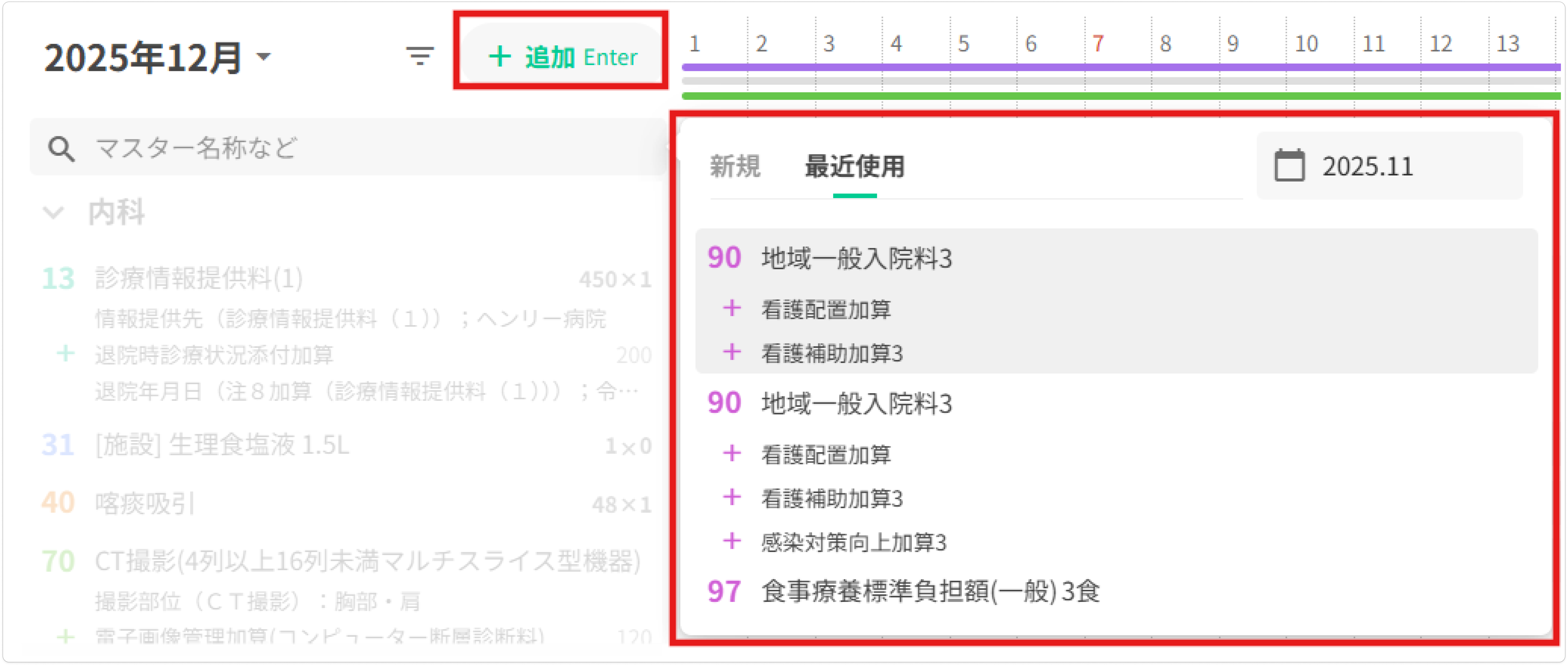 新規に算定単位を追加する場合は[+追加]ボタンよりマスター名称を検索するか、前月以前に算定した内容を[最近使用]タブより選択します。