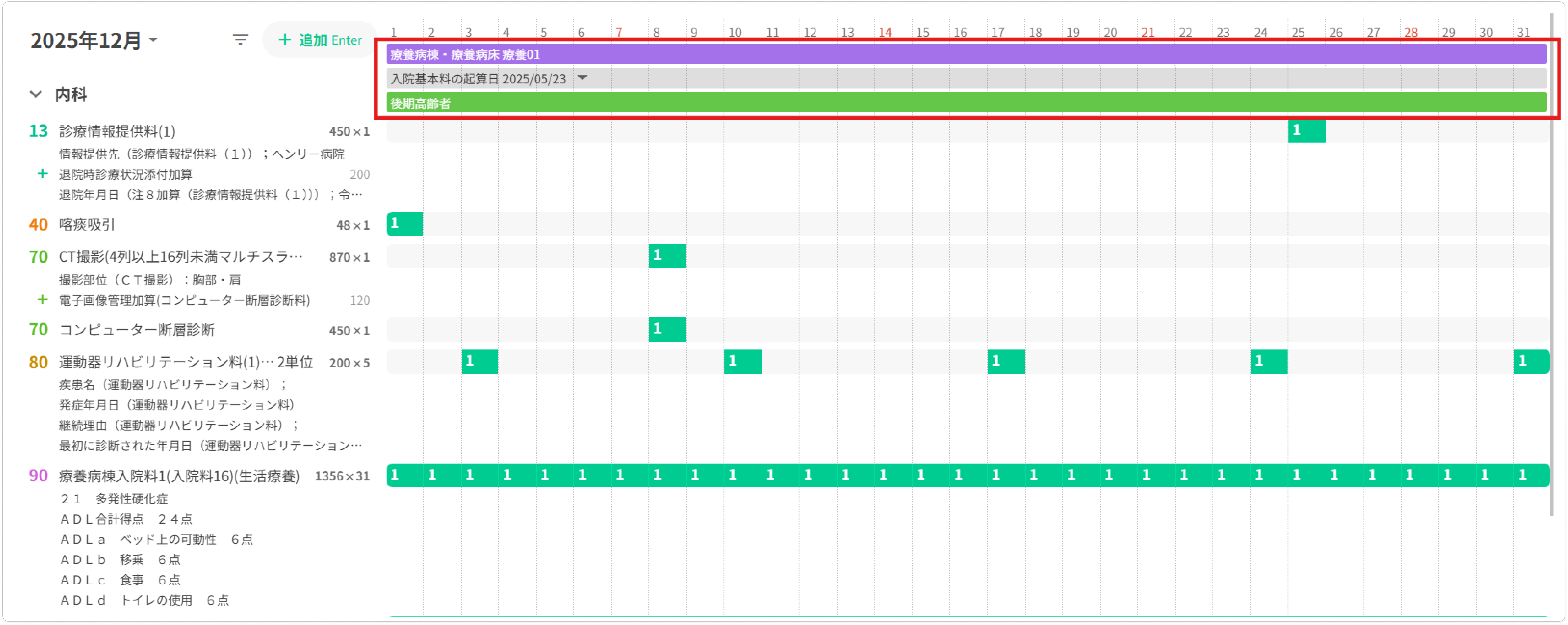 入院保険組合わせが設定されていない場合(自費が適用されます)、保険を表す緑色のバーは表示されません。入院情報編集画面より入院保険組合わせを設定してください。
