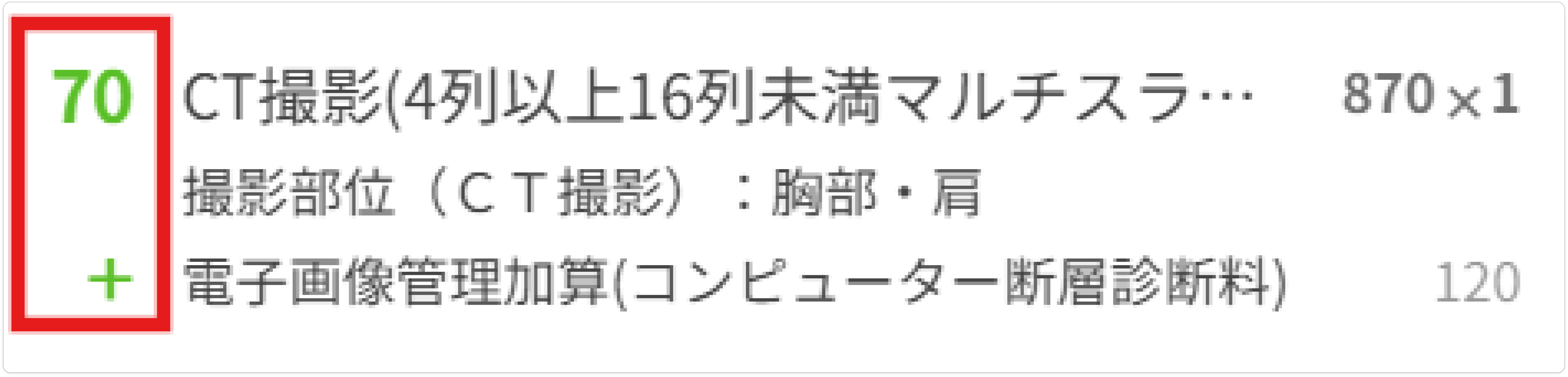 診療識別コードで算定項目を表示します。複数の算定項目が同一算定単位にまとまる場合は+で直下に表示されます。