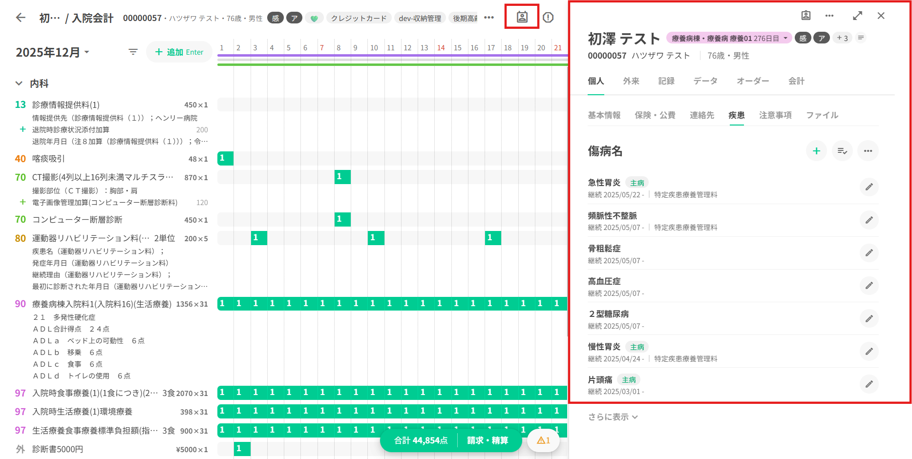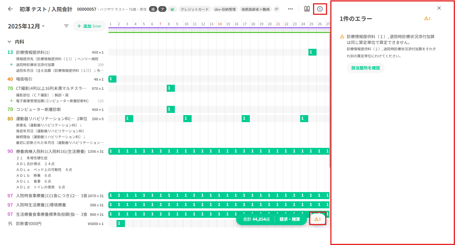 入院患者の会計を作成、確認、編集する場面