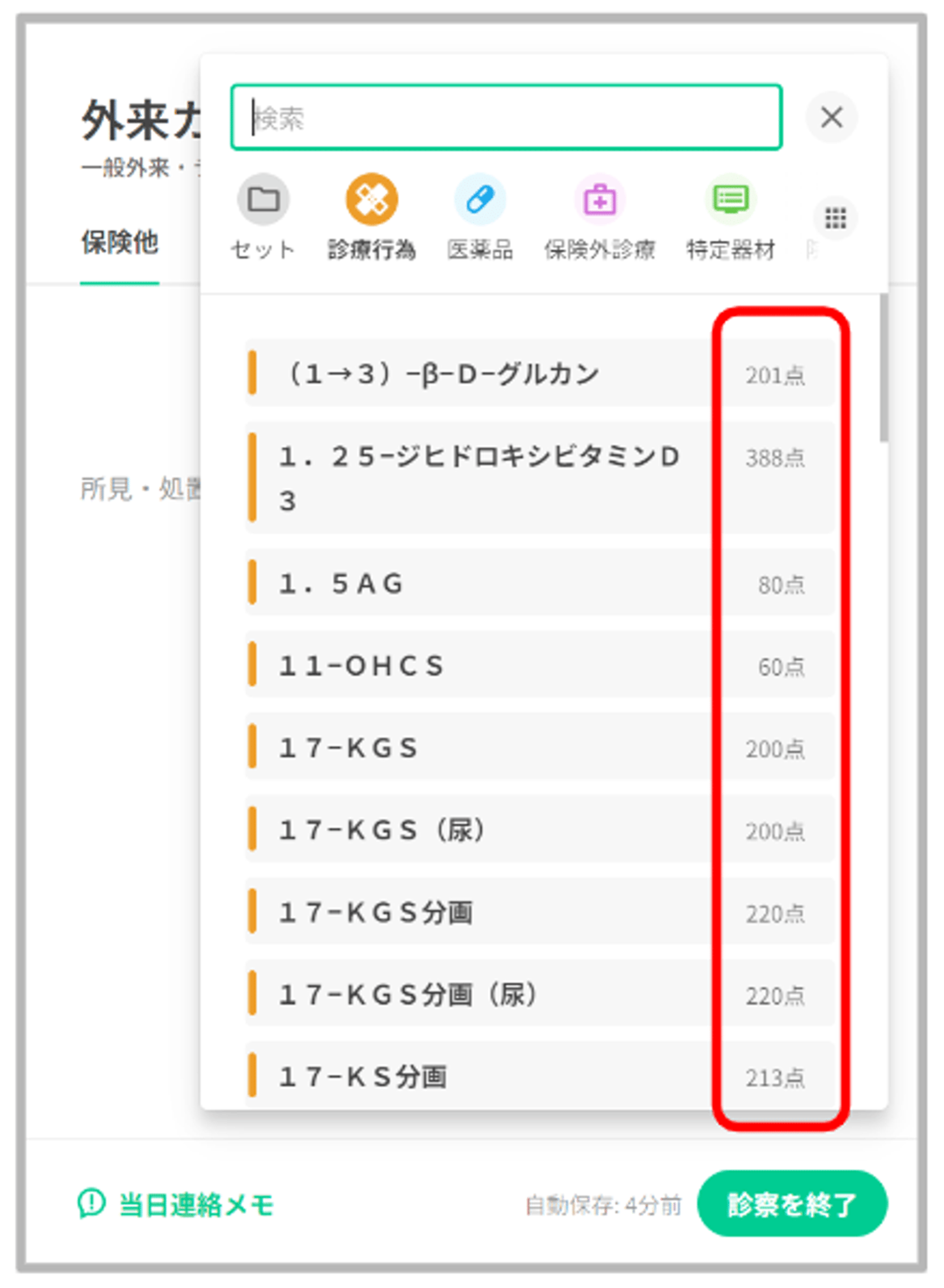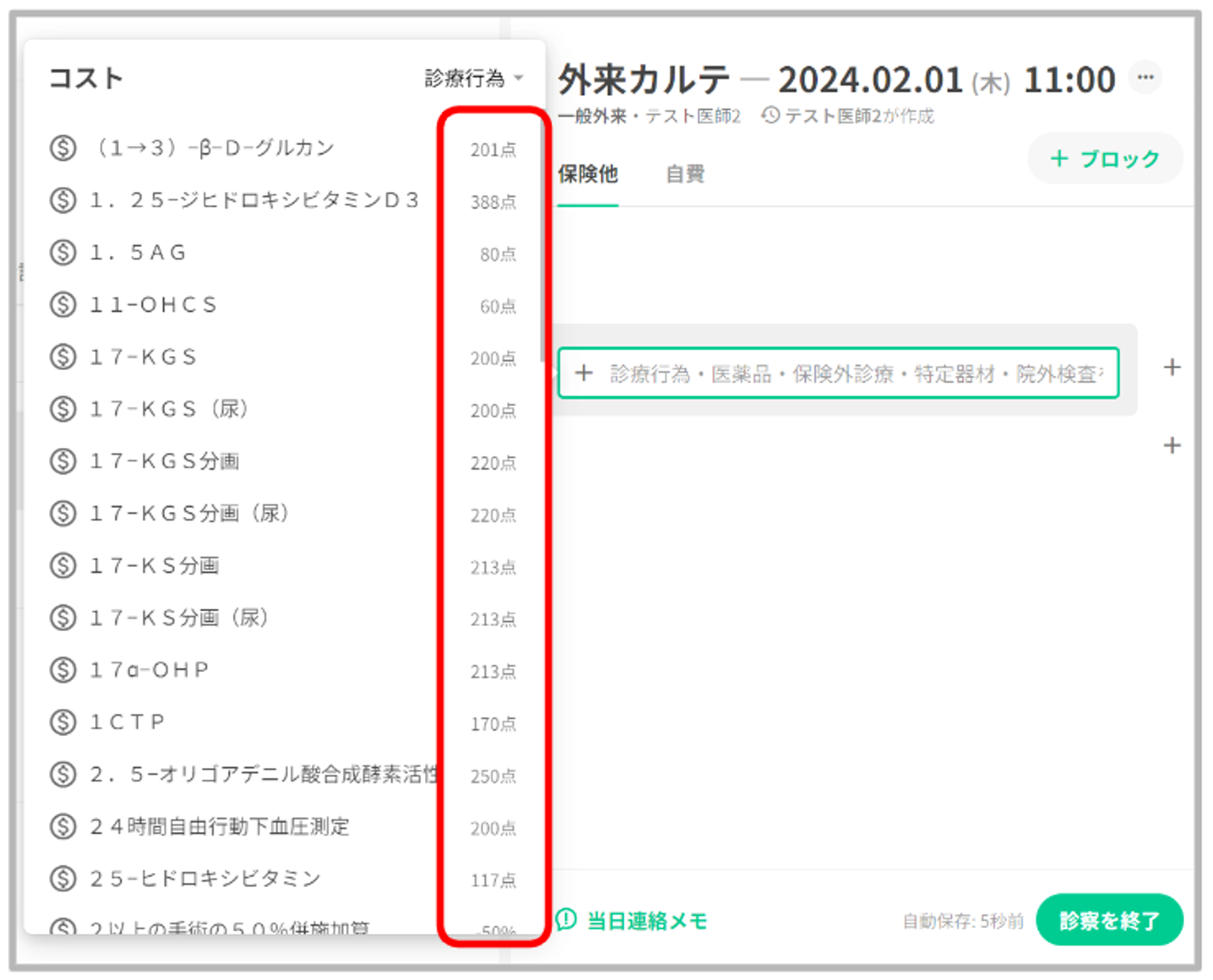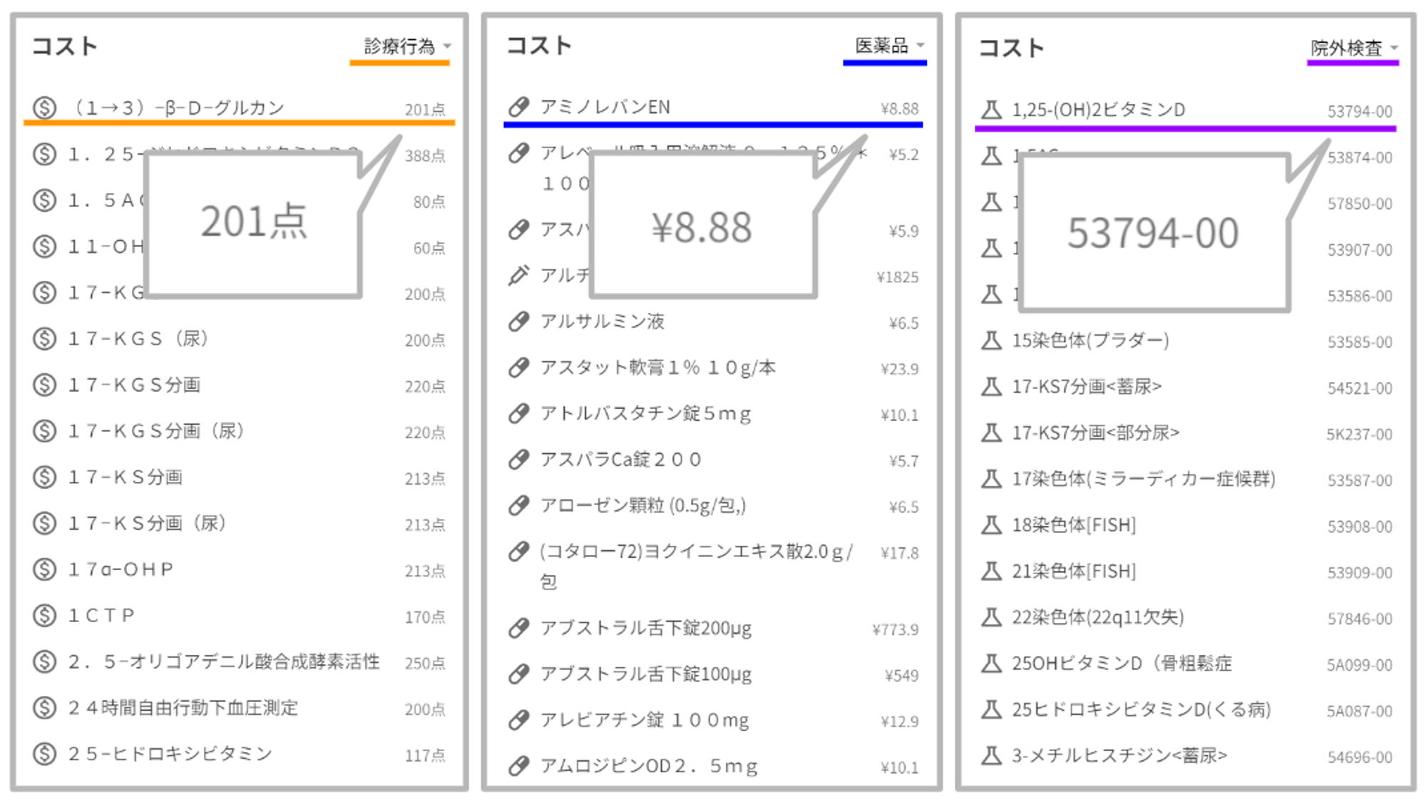 外来カルテでコストを検索する際に、診療行為、医薬品、特定器材のコスト名称横に点数や金額が表示されます。