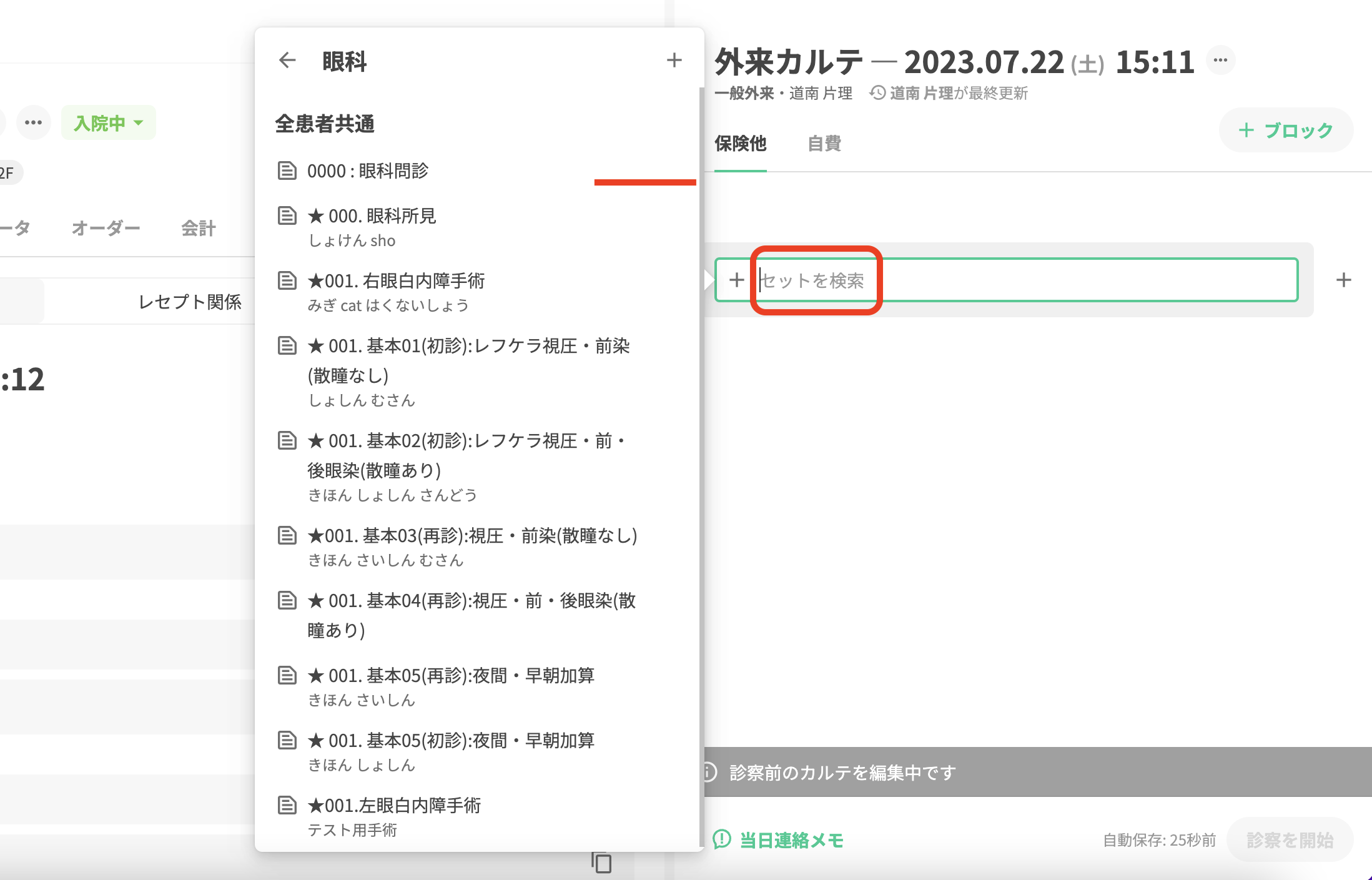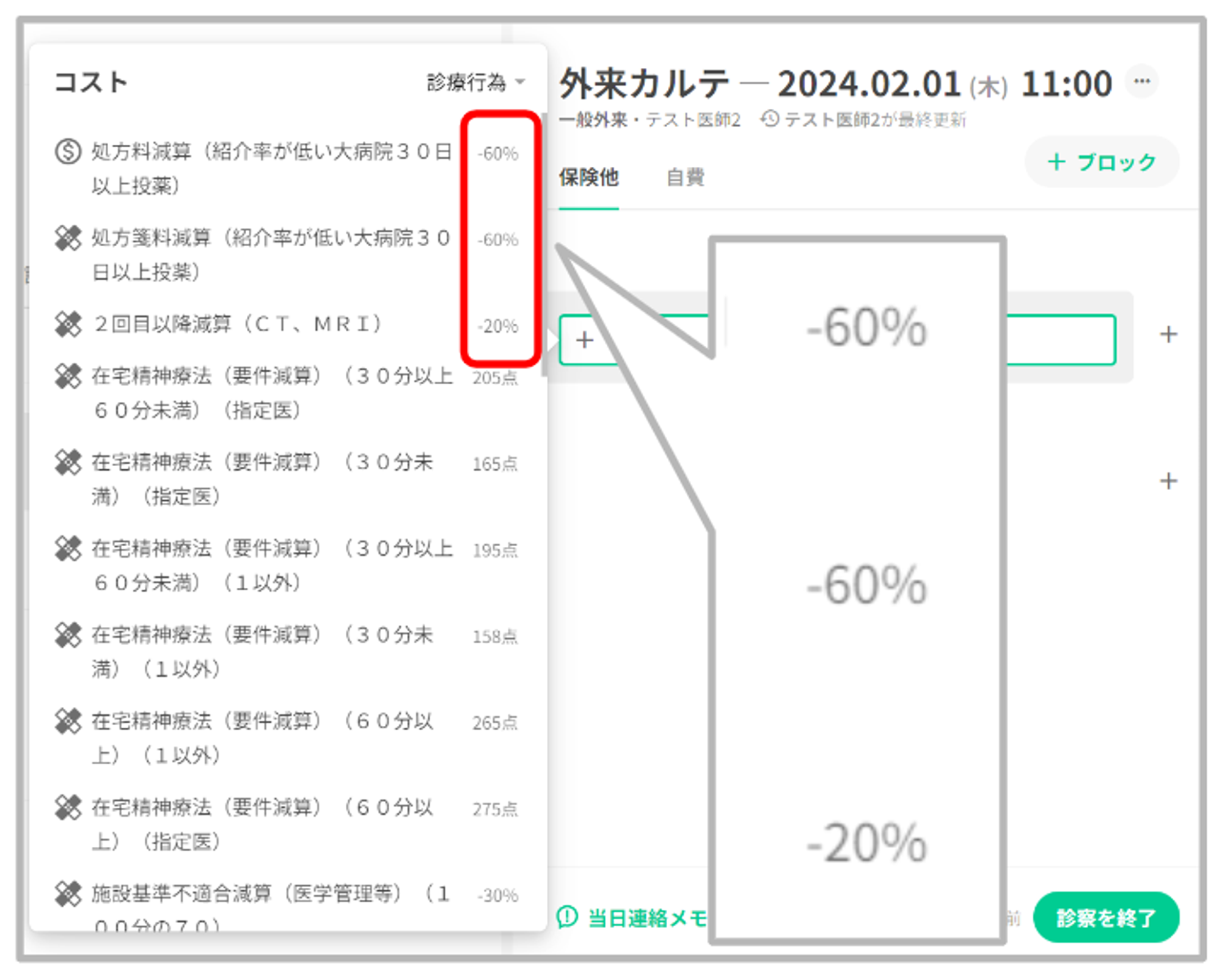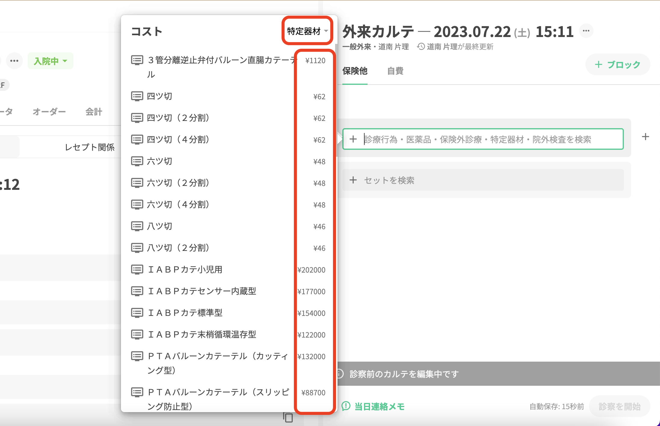外来カルテでコストを検索する際に、診療行為、医薬品、特定器材のコスト名称横に点数や金額が表示されます。
