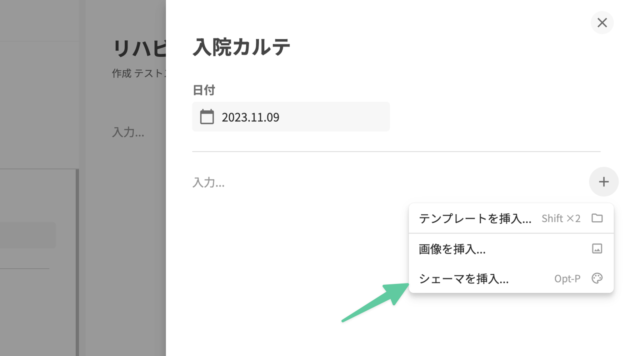 シェーマの挿入は本文編集画面の+ボタンから「シェーマを挿入…」を押下することで追加できます。