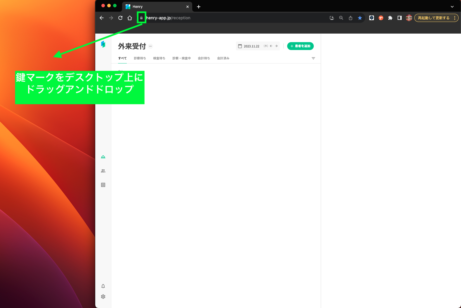 URLが表示されているアドレスバーの左隅にある鍵アイコンをデスクトップ側にドラッグアンドドロップ