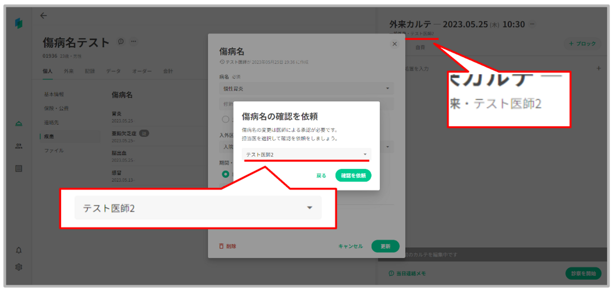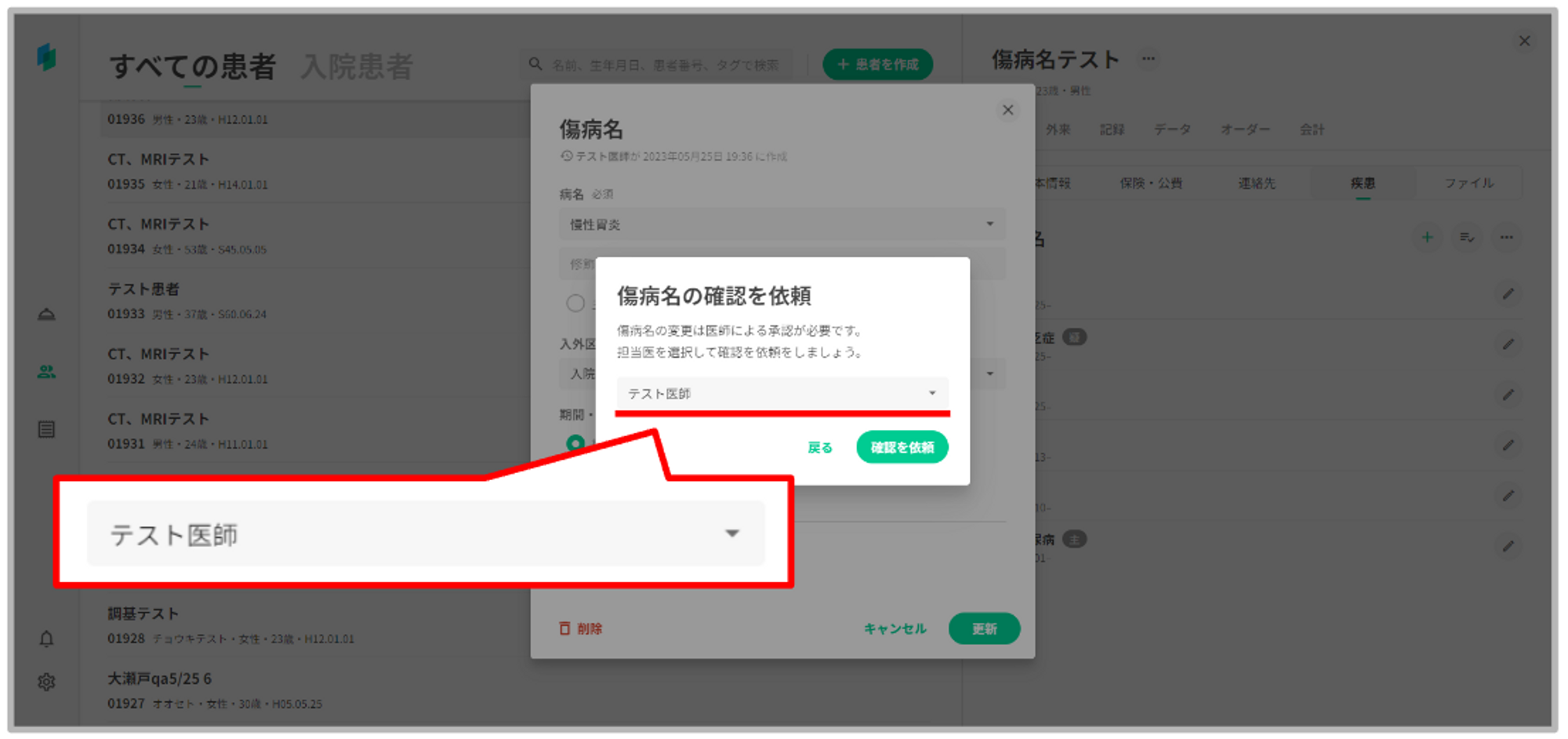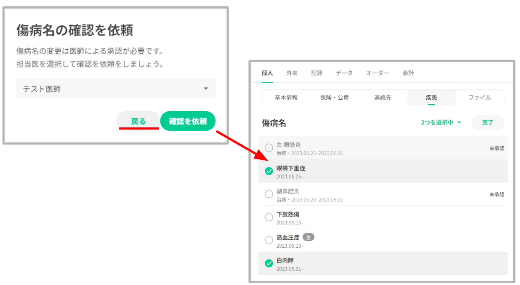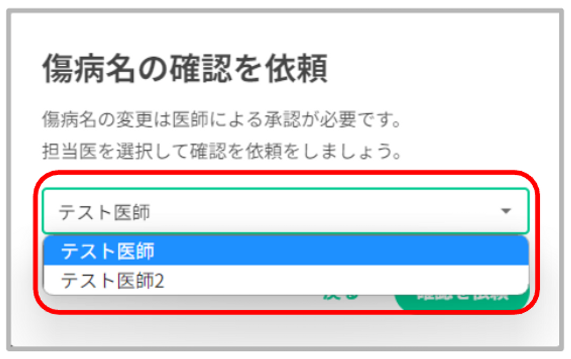 スタッフアカウントで傷病名を追加・編集・削除する際に、任意の医師宛てに確認依頼を作成できます。