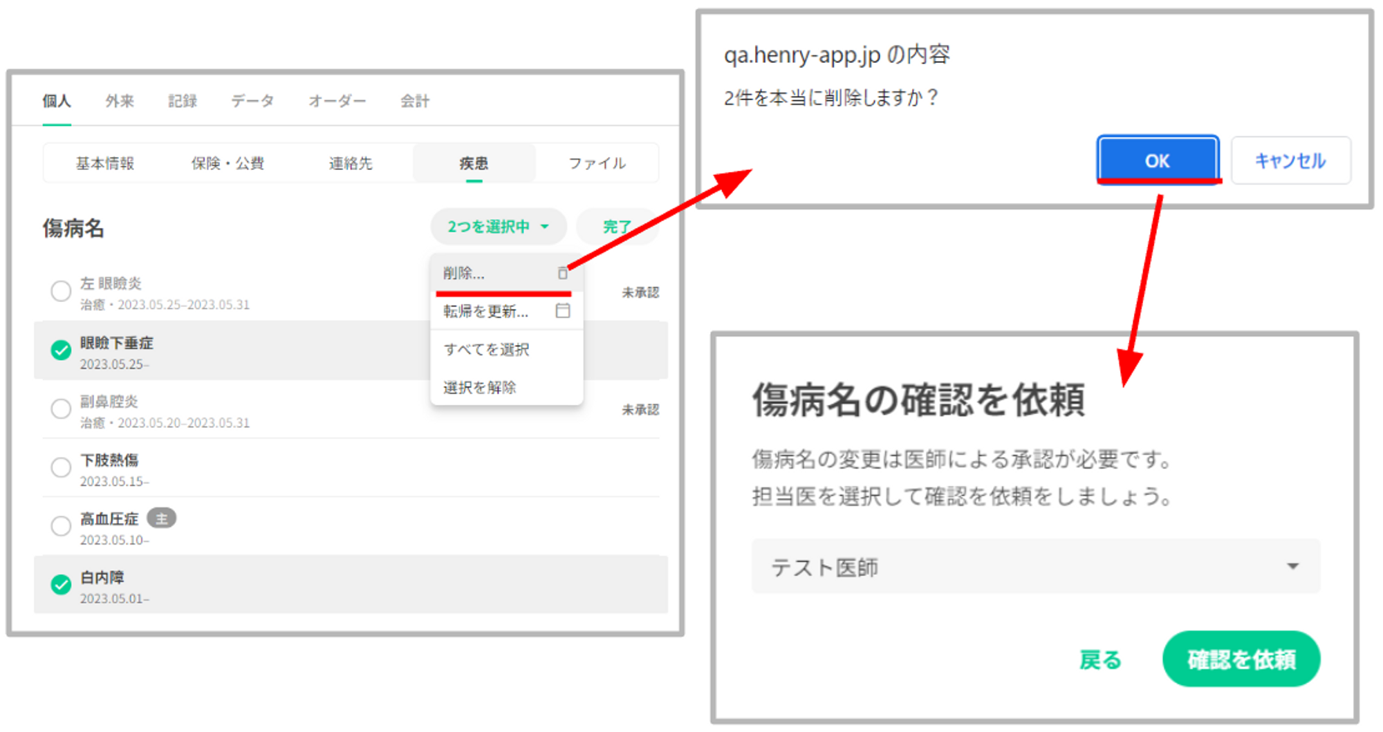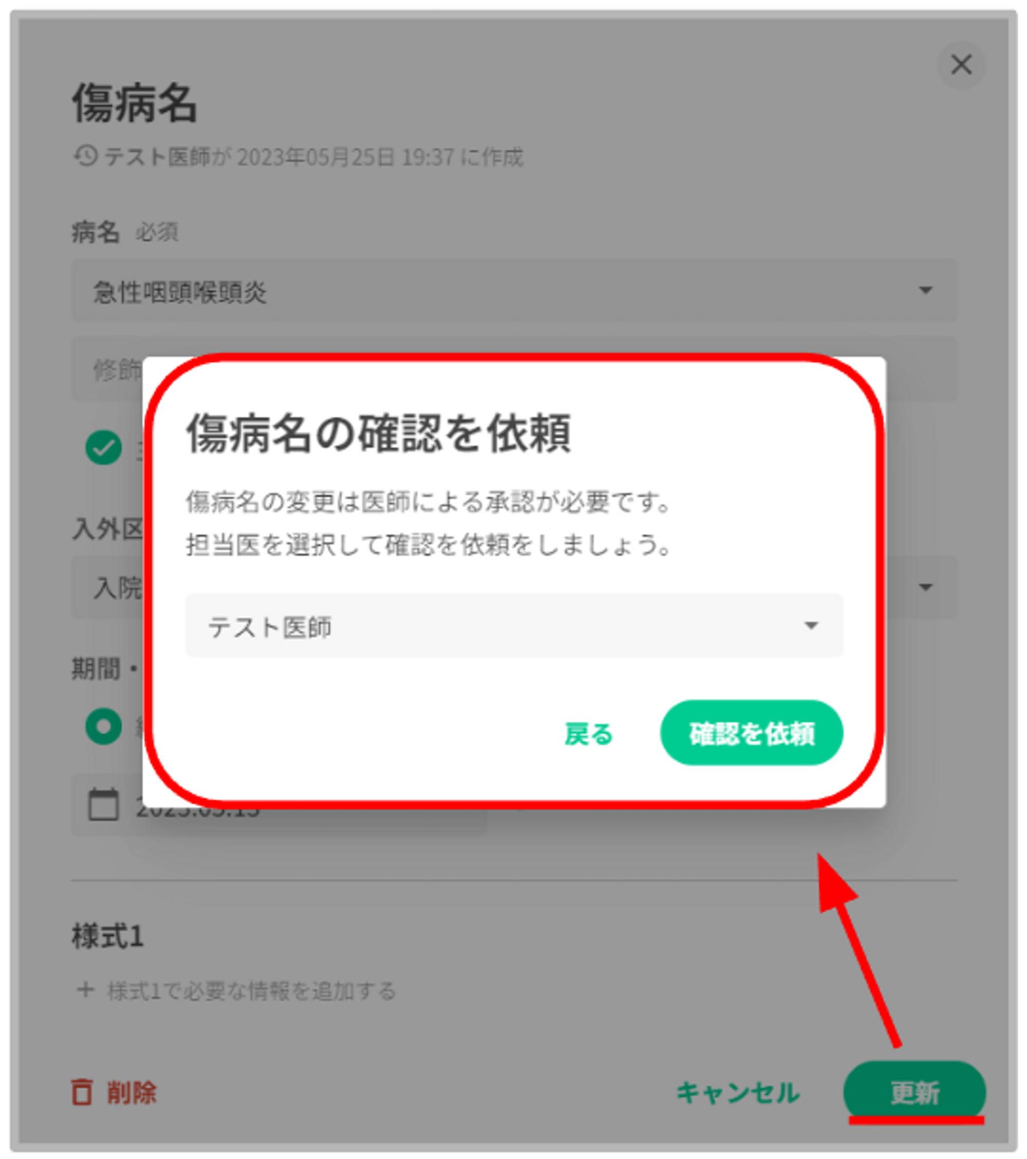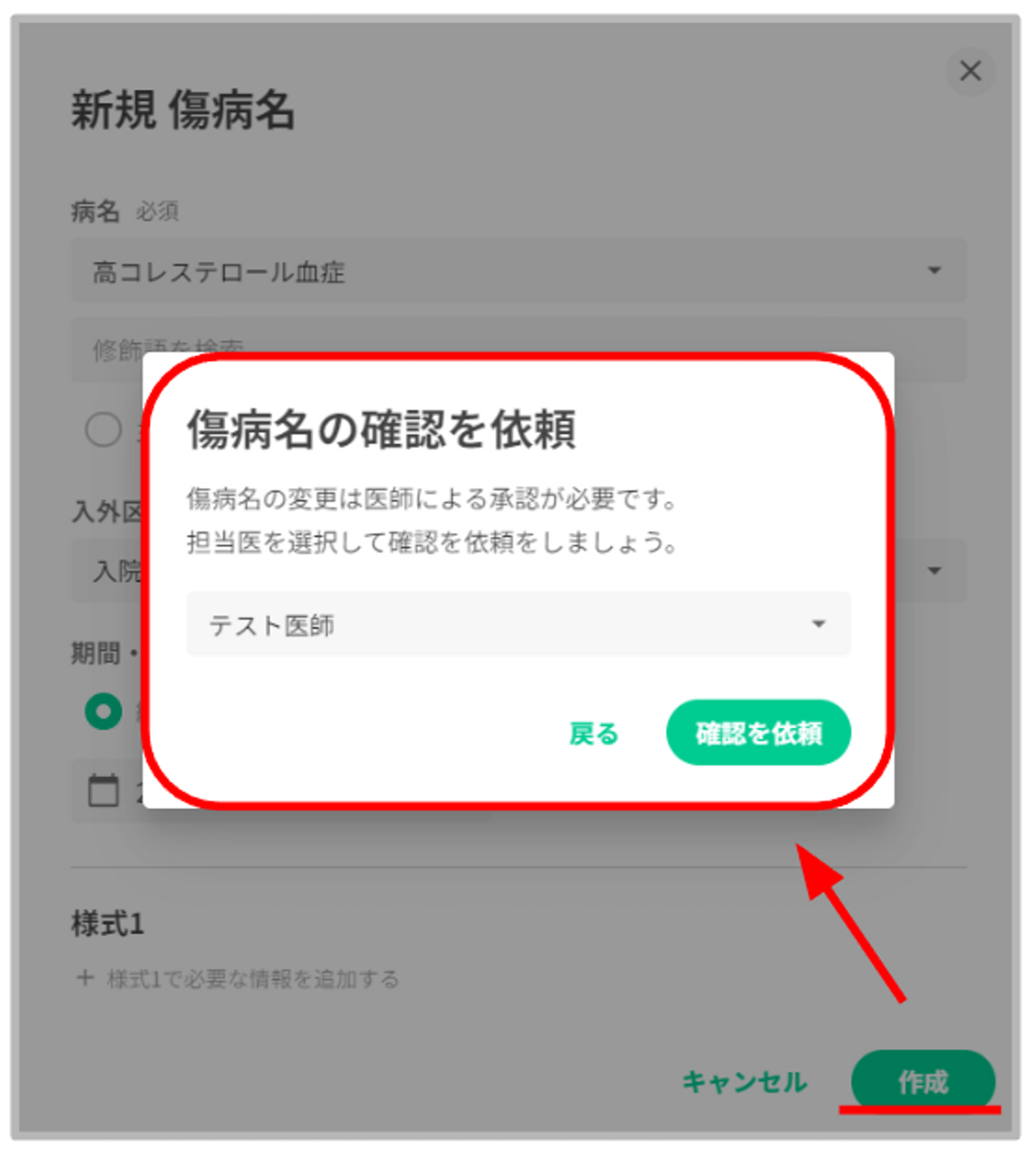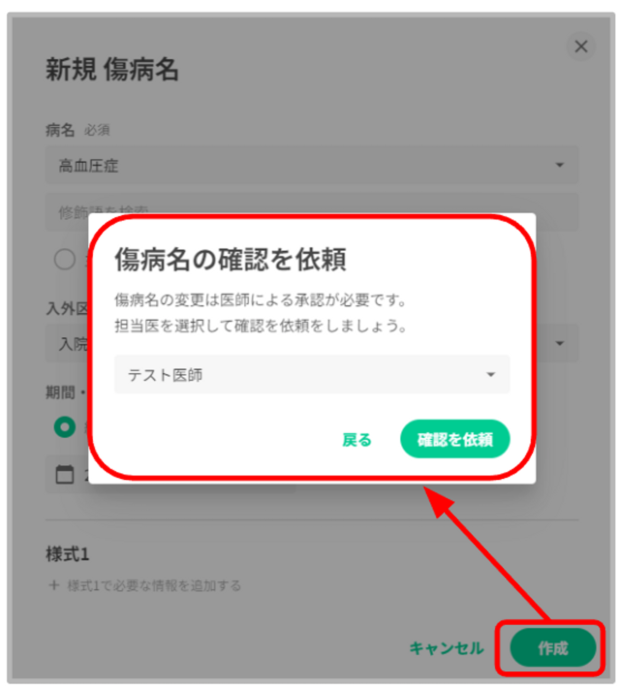 スタッフアカウントで傷病名を追加・編集・削除する際に、任意の医師宛てに確認依頼を作成できます。