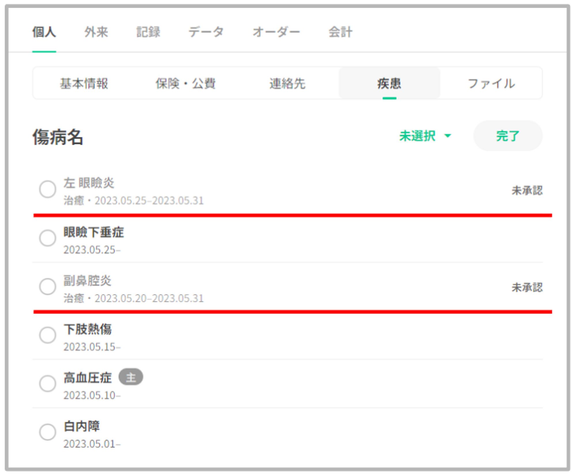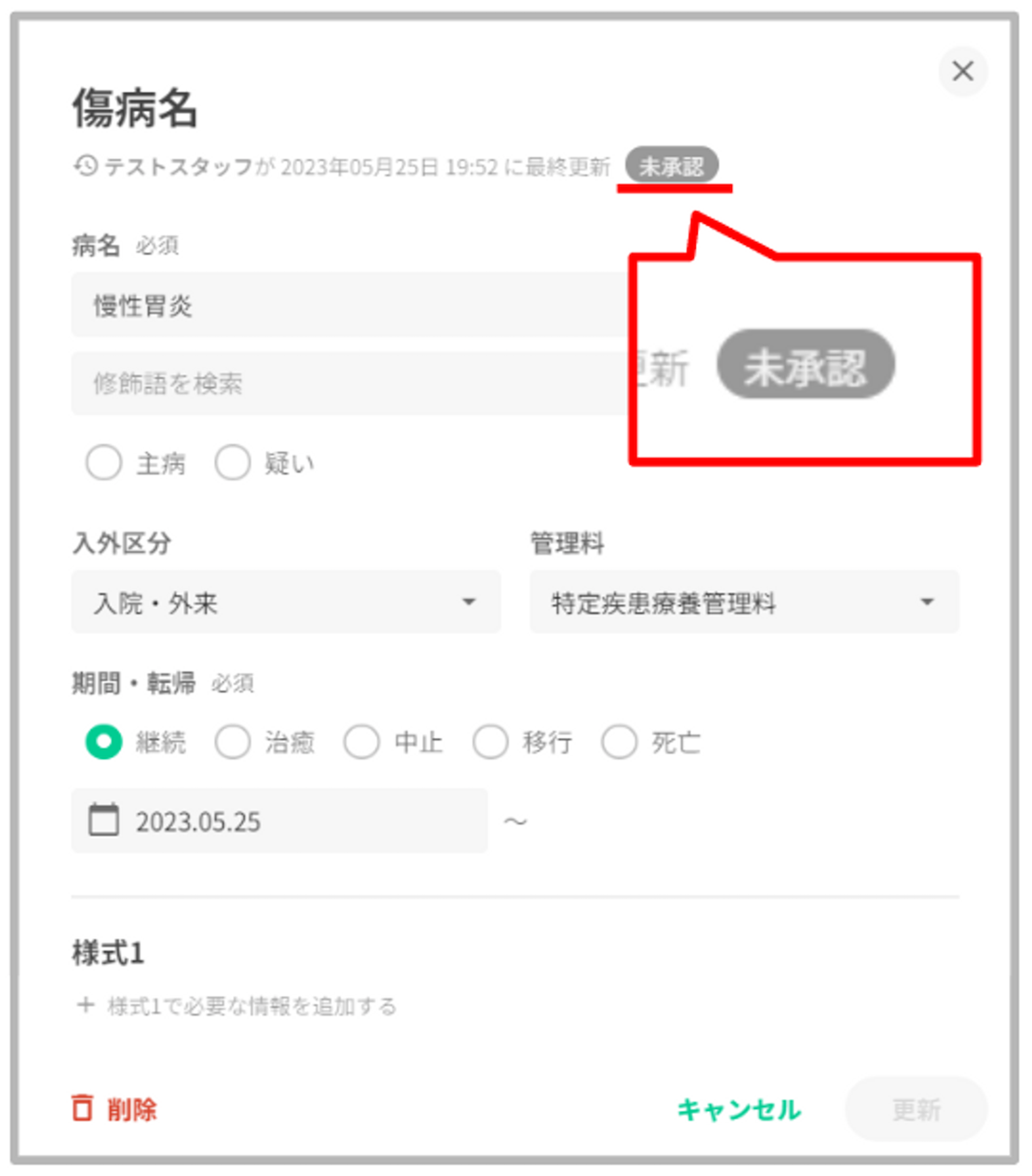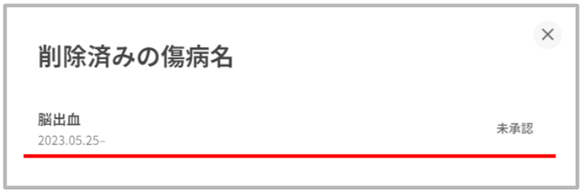 未承認傷病名の場合、最終更新履歴の横に「未承認」と表示されます。